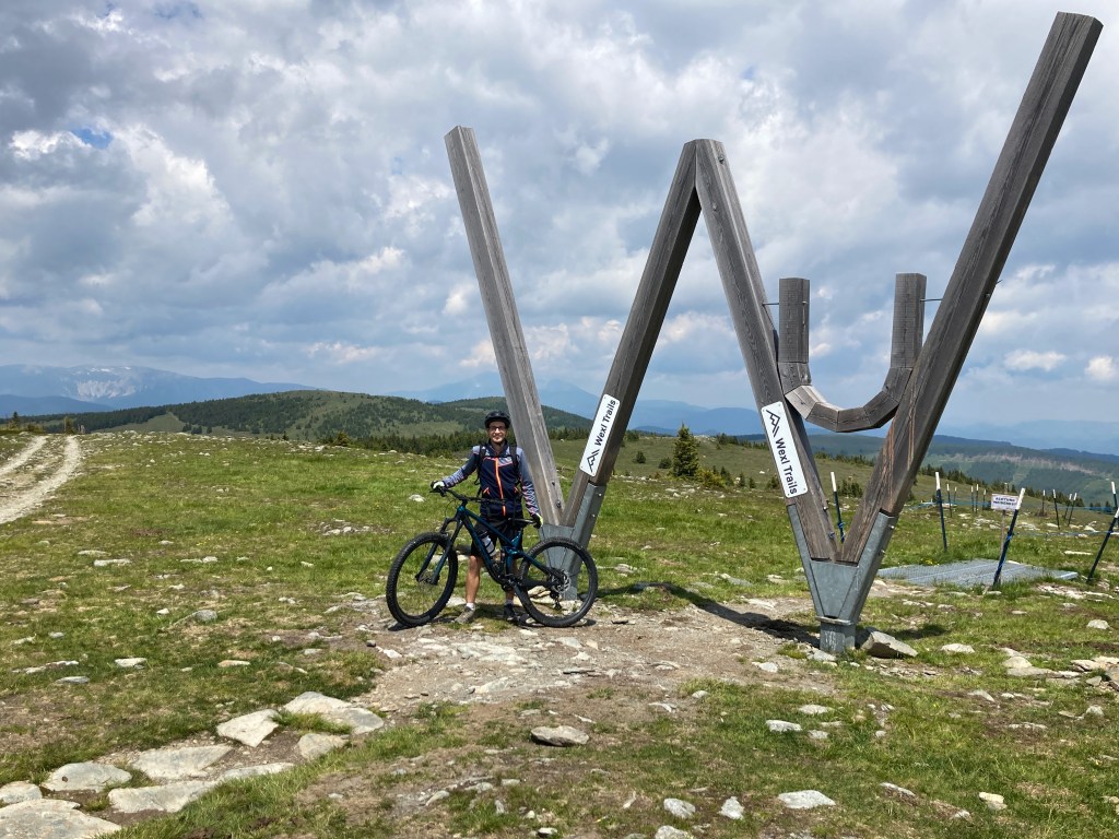 Und damit beginnt auch schon der spaßige Teil unserer Reise – es geht bergab. Und zwar über den WU-Trail. Der grüßt einen gleich mit seinem großen Holzschild, welches den Start markiert. Die Wexl Trails bezeichnen diesen selber als ihr Aushängeschild und ich muss zugeben, der Trail sucht zumindest in Niederösterreich seines Gleichen. Man startet direkt am Gipfel, wo man das gesamte Wechselland bis hin zu Schneeberg, Rax und der hohen Wand im Blick hat und fährt dann über Stock und Stein die Almwiese hinab. So nahe bei Wien findet man wohl nicht so schnell ein ähnlich alpines Flair zum Mountainbiken. Der Weg bergauf hat sich also allemal gelohnt. Wir schmeißen uns also in die Anlegerkurven, nehmen die Sprünge die wir uns zutrauen mit, passieren ein weiteres Mal eine Kuh die den Trail als Liegeplatz nutzt und kommen so, nach einer spaßigen Abfahrt, an der Marienseer Schwaig an.
