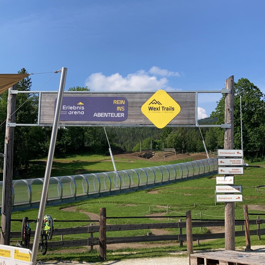 Dank dem Zwickeltag ist weder auf A2 noch auf der A23 viel Verkehr und so sind wir nach einer entspannten Fahrt von einer Stunde am Parkplatz der Erlebnisarena Sankt Corona am Wechsel angekommen. Hier herrscht auch schon reges Treiben, Bikes werden von Heckträgern, Ladeflächen und aus Kofferräumen gehievt, Ketten geschmiert und Reifen aufgepumpt. Als Biker fühlt man sich da irgendwie angekommen. Über den Holzsteg sind wir auch schnell an der Kasse angekommen und bezahlen jeweils die 9€ für die Trailnutzung. Den Bikelift sparen wir uns, heute wollen wir ja schließlich hoch hinaus. Bevor es losgeht gibt es noch ein kleines Frühstück, während einige Kids im Mini Bikepark über Holzrampen düsen und Downhiller ihre Full Face Helmets aufziehen um dann in voller Montur zum Lift zu rollen.