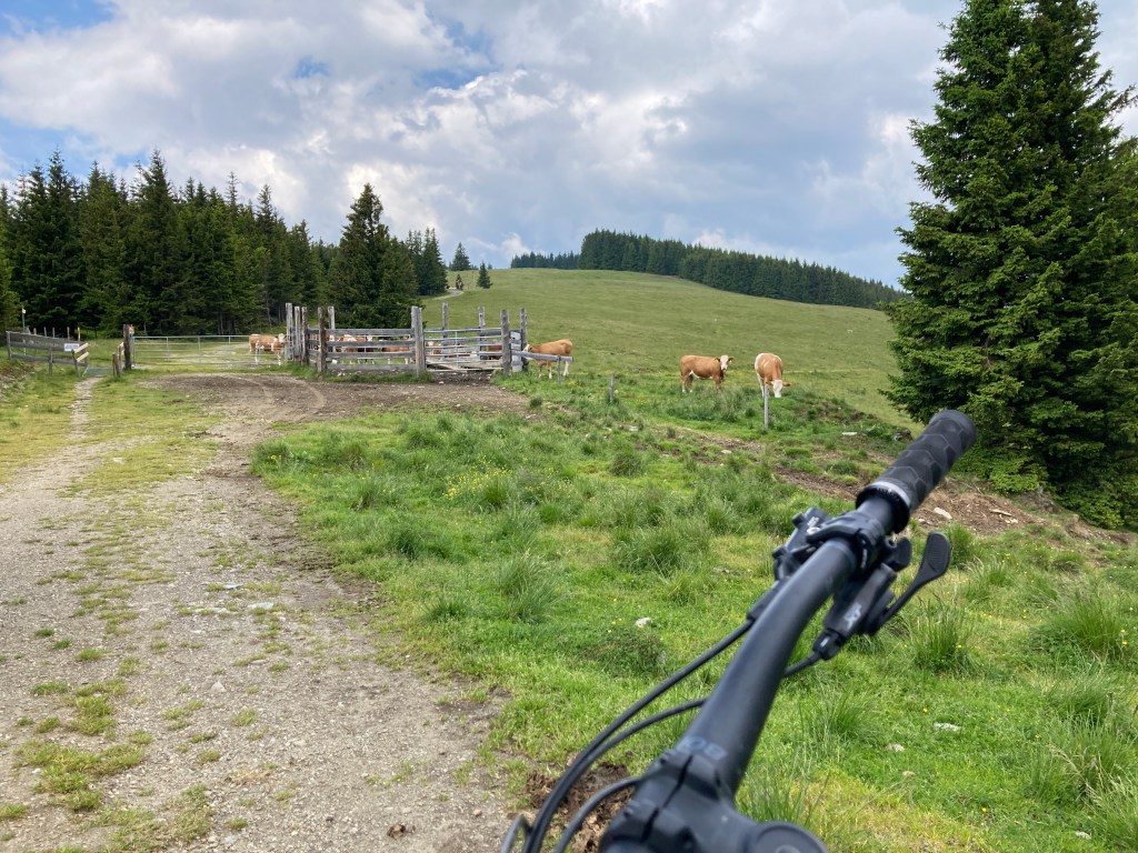 Wir treten hoch zur Feistritzer Schwaig (hierzu später mehr) und werden erstmal von einer Kuhherde an unserer Weiterfahrt (nun Trail Nr.10) gehindert. Selbstbewusst aber respektvoll bahnen wir uns den Weg durch die Wegelagerer, die muhend und mal mehr mal weniger bereitwillig den Platz freimachen. Eines steht fest, wer auf den Gipfel will, sollte keine zu große Angst vor Weidevieh haben. Der Weg belohnt uns anfangs mit toller Aussicht zum Etappenziel, dem Hochwechsel, und verläuft dann unspektakulär im Wald weiter, wo er dann zur Finalen Etappe (Nr.22) übergeht.