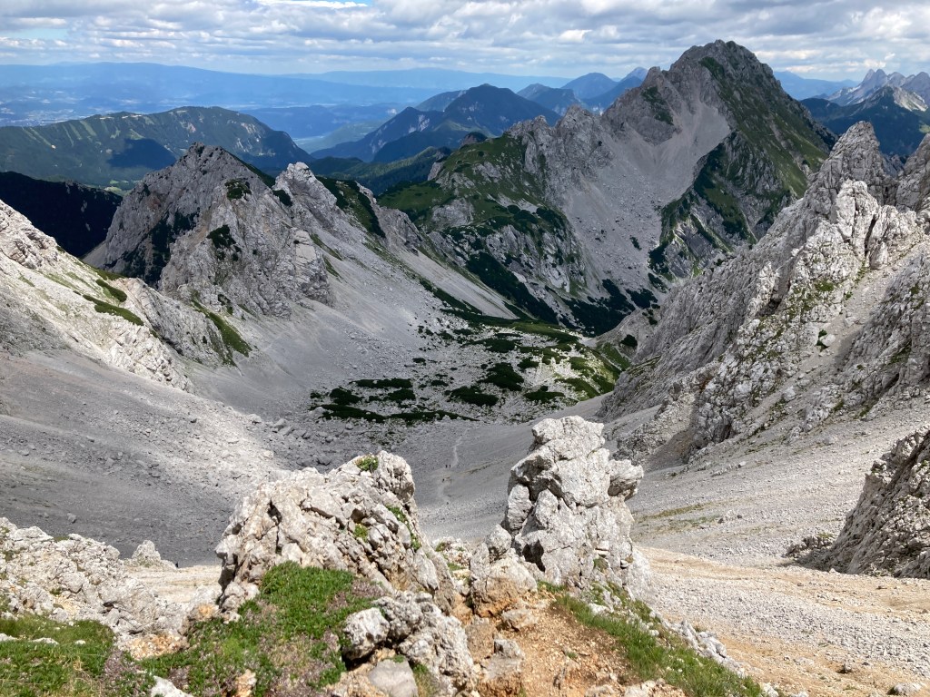 Unmittelbar nach dem Gipfel werden wir noch von einer grasenden Schafsherde mit aufgeweckten „MÄH“ Lauten begrüßt, bevor wir in einen Talkessen absteigen. Leider hält sich hier die Wanderlust in Grenzen, der Weg ist steil und geröllig, daher kommen wir erstmals nur langsam voran. Eine slowenische Familie läuft vor uns über das Schotterfeld ab, so flott werden wir wohl nicht unten ankommen.