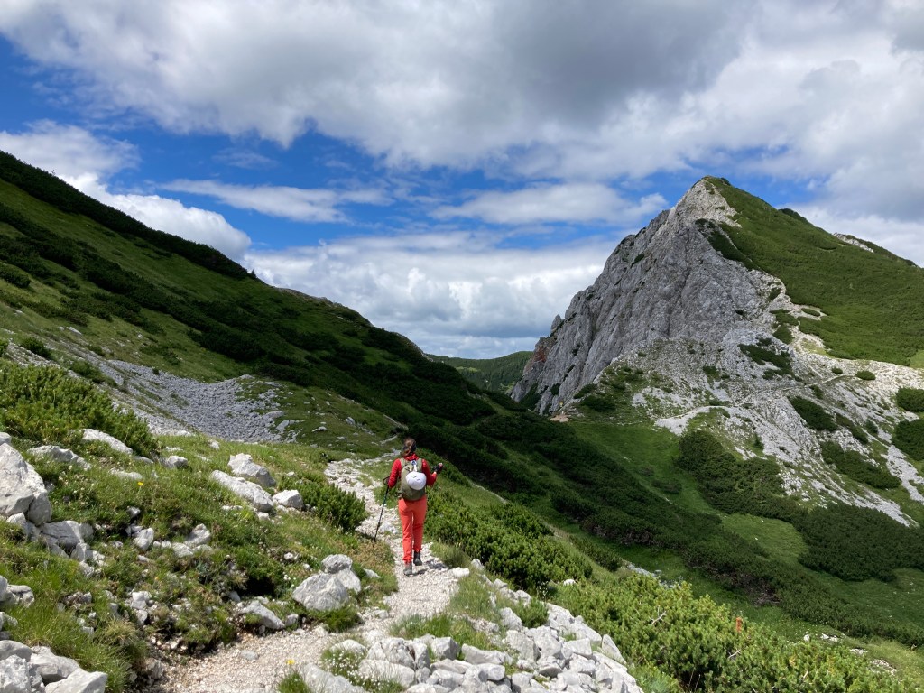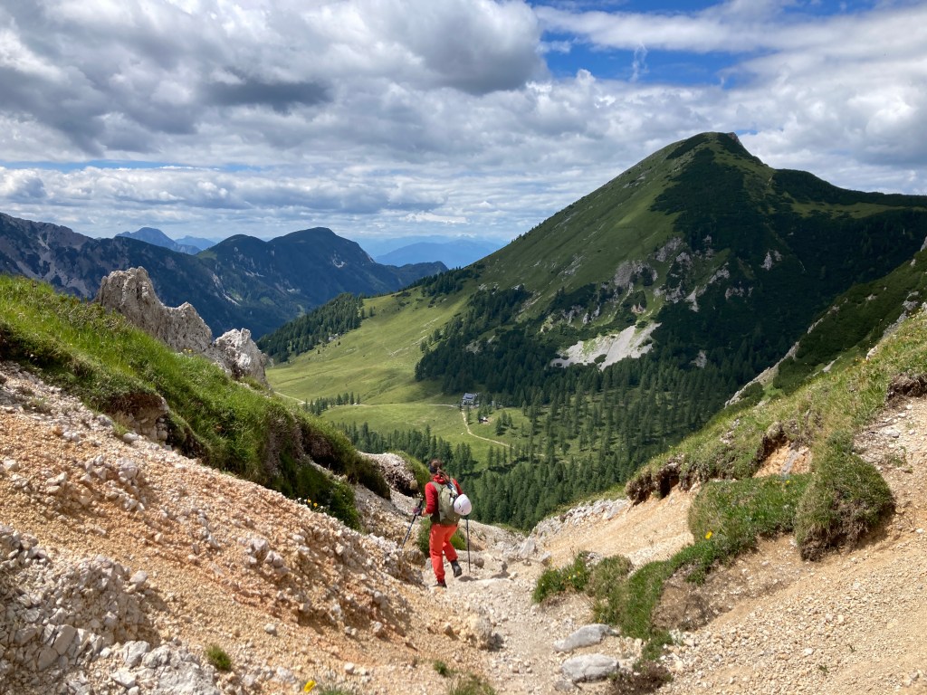 Nach dem mühseligen ersten Abstieg (wir haben hierfür eine dreiviertel Stunde gebraucht) flacht der Weg wieder ab und führt uns durch den Talkessel. Dieser erstreckt sich recht weit bis wir dann schließlich einen Südhang queren, wo wir noch einen letzten Blick zurück auf den Gipfel des Hochstuhls werfen. Dann steigen wir auf zur sogenannten „Gamsgrube“, wobei es hier für ein kurzes Stück unsere Hände als Unterstützung braucht – eine willkommene Abwechslung zum Abstieg. Auch die Gamsgrube selbst stellt noch ein abschließendes Highlight da – wir wandern durch sanfte Hänge die von einem bunten Blumenmeer bevölkert werden.