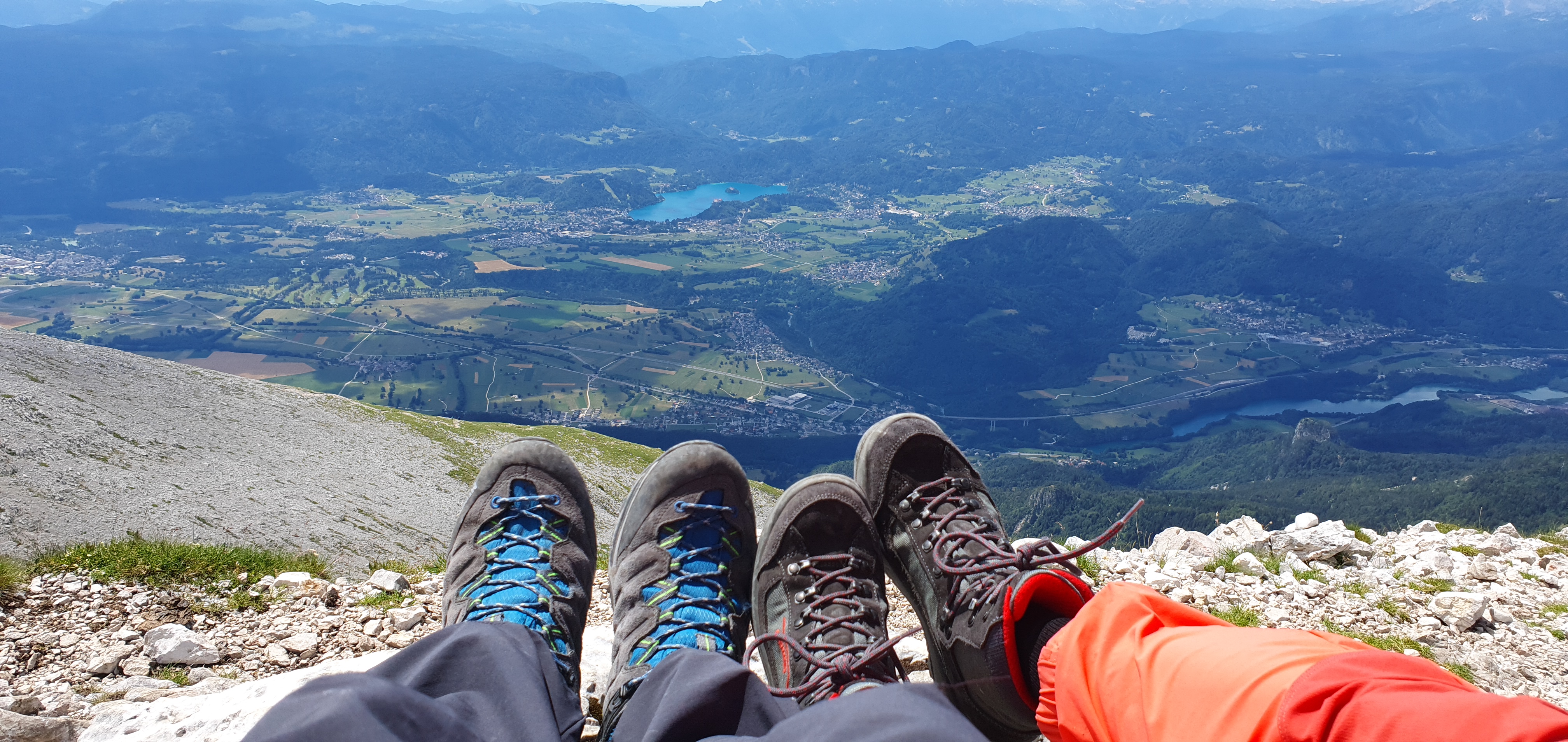 Nach insgesamt dreieinhalb Stunden kommen wir überglücklich – und äußerst hungrig – am umgefallenen Gipfelkreuz an. Der Blick zurück ist atemberaubend, man sieht die steil abfallenden Nordwände Richtung Bärental, die grasbewachsenen Südhänge nach Slowenien während im Hintergrund der höchste Berg Sloweniens, der Triglav (2.864m) emporragt. Wir machen es uns in dieser Kulisse bequem, die Felsen am Gipfel eignen sich optimal als Sitzgelegenheit mit Lehne – vielleicht daher der Name „Hochstuhl“ – und genießen unser verdientes Mittagessen mit Ausblick auf den Bleder See und seiner, auf einer Insel stehenden, berühmten Kirche.