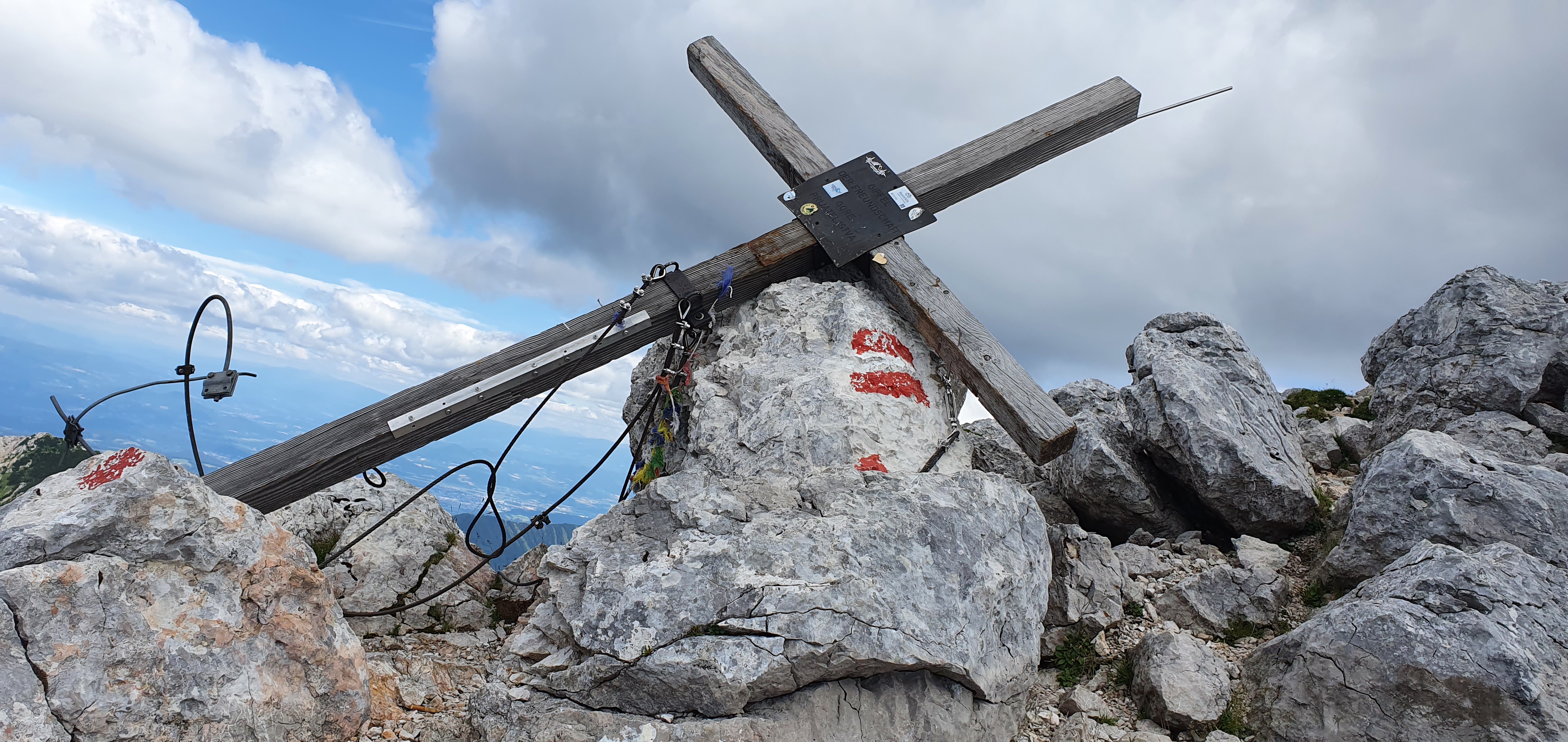 Am oberen Ende des Steiges tragen wir uns ins Steigbuch ein und verlassen diesen über eine versicherte Rinne. Die Wanderstecken werden wieder aus dem Rucksack geholt und es beginnt ein in Serpentinen, durch ein Schotterfeld führender Weg. Hier sei vermerkt, dass der Weg nicht immer klar zu erkennen ist und man sich das Leben unnötig schwer machen kann, wenn man diesem nicht aufmerksam folgt. Also lieber zweimal schauen, wo man entlanggeht. Schließlich gelangen auf den Gipfelgrat – damit queren wir die Landesgrenze und legen die letzten Höhenmeter in Slowenien zurück.