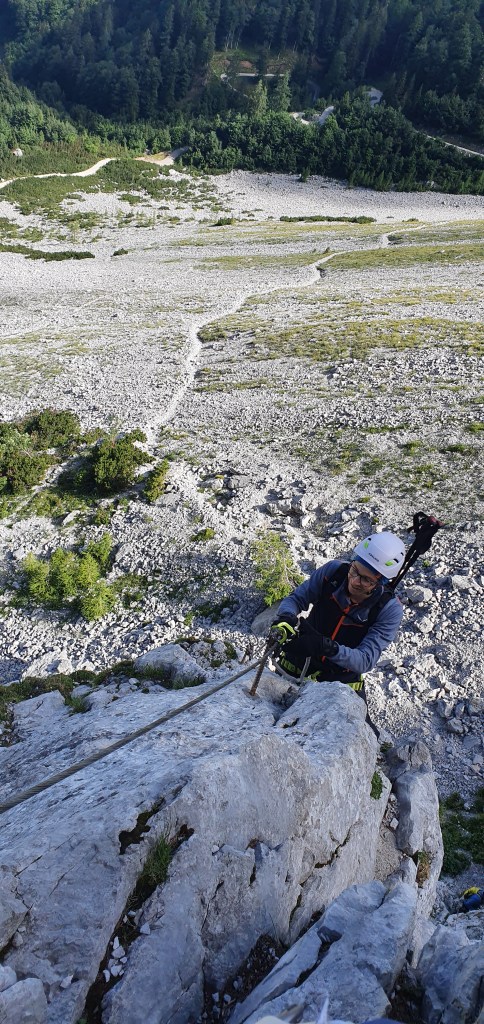 Wir begeben uns auf das Schotterfeld und queren Richtung Einstieg. Der bewaldete Felsrücken, über den der Steig startet, ist schon gut sichtbar und man erkennt auch schon einige, die sich im Steig hinaufarbeiten. Wir legen nach gut einer Stunde Zustieg unsere Klettergurte an und binden unsere Klettersteigsets ein. Rucksäcke zu, Helme auf, Handschuhe an, Partnercheck und ab geht’s.