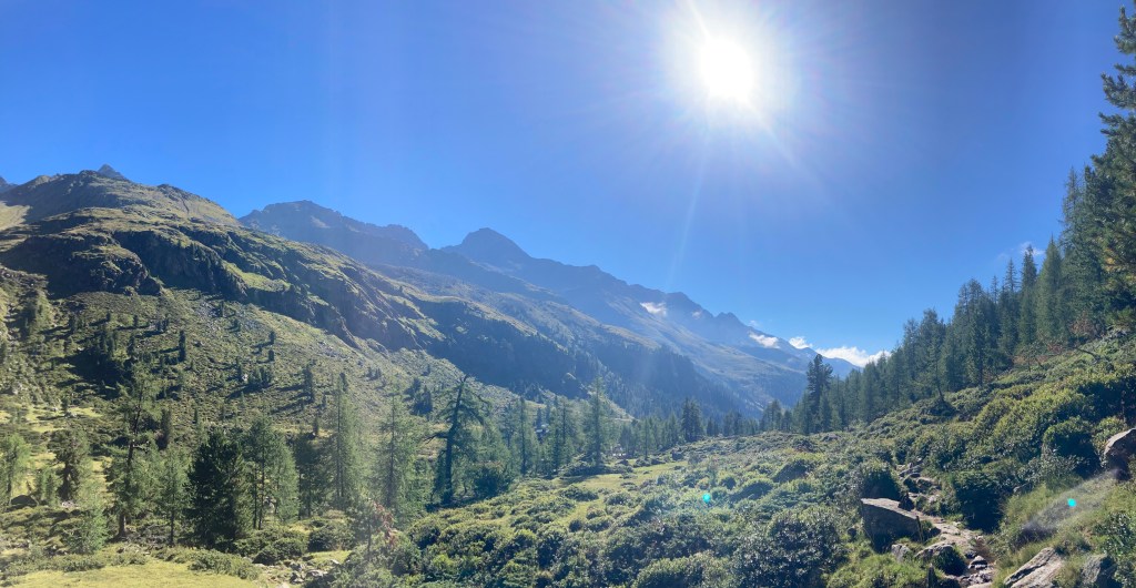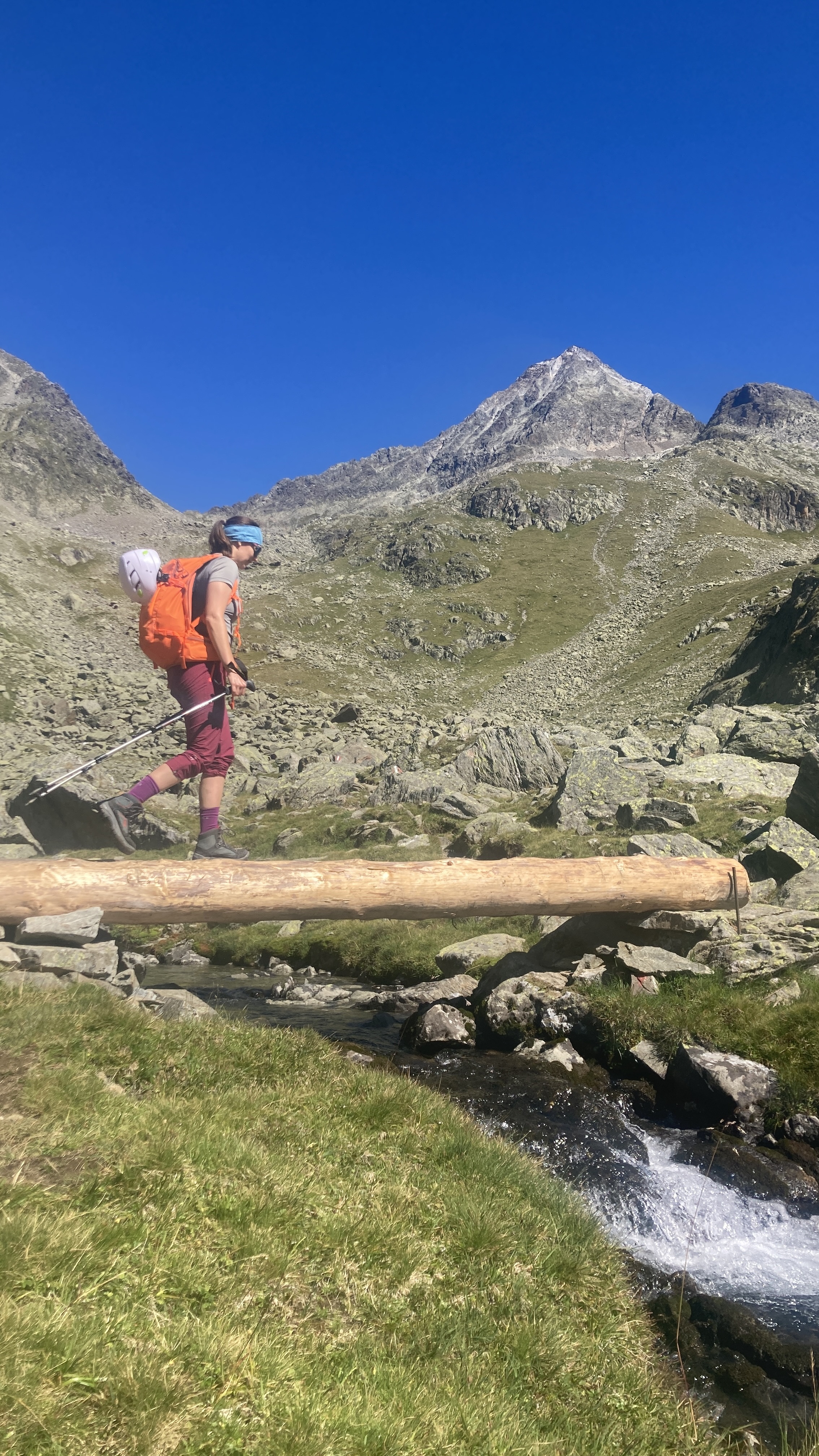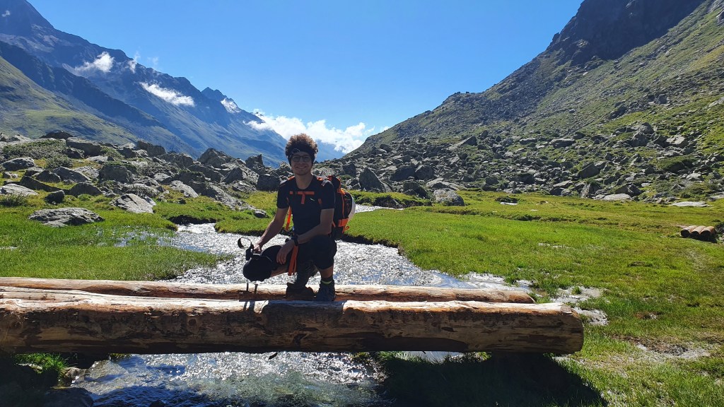 Bald darauf kommen wir auf eine der wenigen Weggabelungen. Der Abzweiger nach links würde Richtung Hochschober und der gleichnamigen Hütte führen, wir folgen dem Weg rechts, weiter Richtung Glödis. Nach einem kleinen Abstieg durch größeres Geröll erwartet uns ein großes, von saftig grünem Gras gesäumtes Flussbett, welches wir auf einer Holzbrücke überqueren. Da das Wasser von Karseen und Quellen entspringt, ist dieses glasklar. Auf der Brücke stehend hat man einen umwerfenden Blick zurück ins Debanttal. Dieser kombiniert mit der frischen Bergluft und dem Rauschen des Wassers machen diesen Platz für mich zu einem wahren Kraftort.