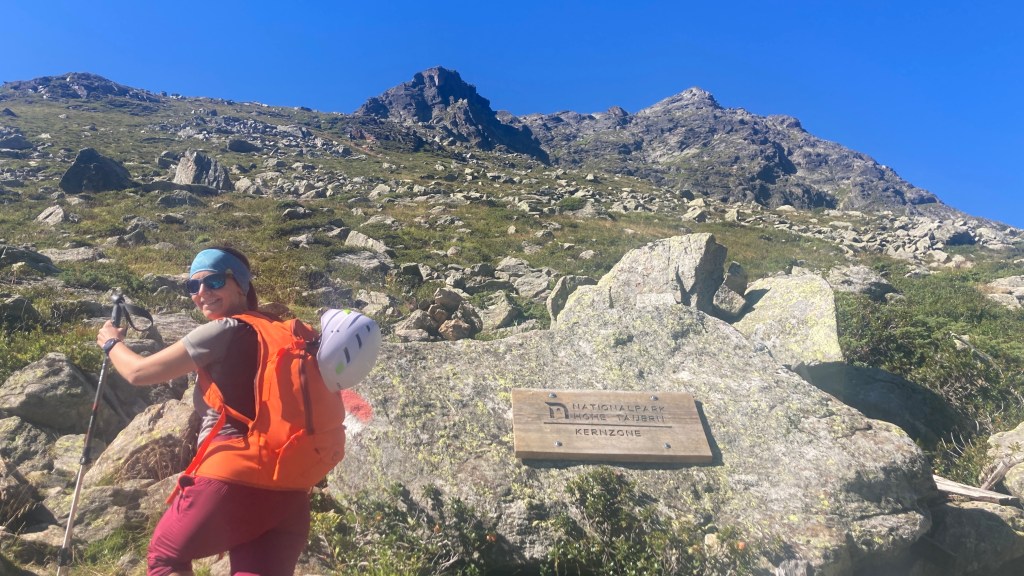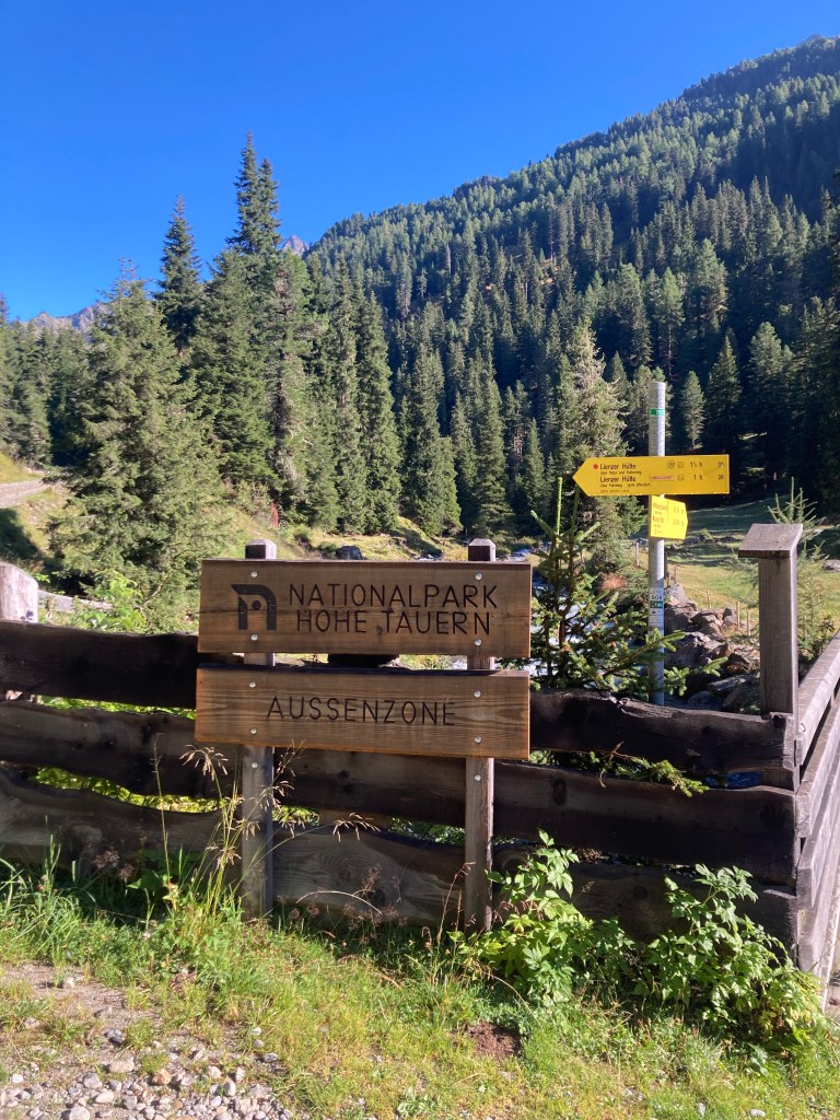 Nach und nach schwinden die Latschen und gehen in grüne Almwiesen über. Bislang sind wir lediglich zwei Trailrunnern, die uns überholt haben, und einer weiteren Kuhherde, die uns muhend gegrüßt hat, begegnet. Ein Schild weist uns darauf hin, dass wir die Grenze zur Kernzone des Nationalparks Hohe Tauern überqueren und entsprechend unberührt sieht die Umgebung aus.
