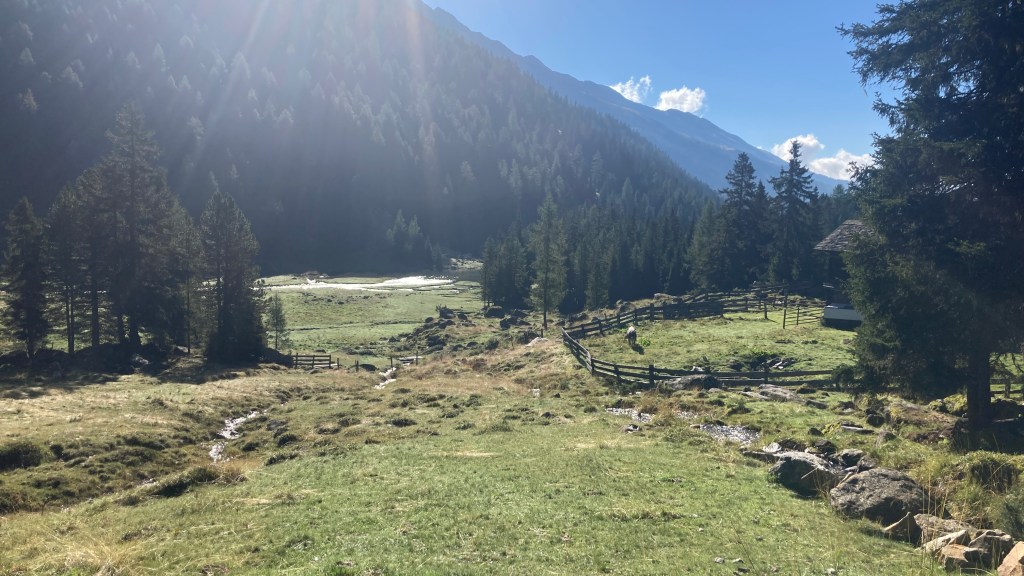 Es ist noch zeitig am Morgen, viel Zeit ist noch nicht vergangen, seitdem die ersten Sonnenstrahlen ihren Weg über den Kammrücken und ins Tal gefunden haben. Von der kühlen Nacht sind die Pflanzen noch voller Tau, welcher die Wärme der Sonne aufsaugt und als dünne Nebelschwaden in die Luft aufsteigt. In dieser herrlichen Atmosphäre starten wir also in unsere Tour, welche zu Beginn entlang einer Schotterstraße zur Lienzer Hütte führt.