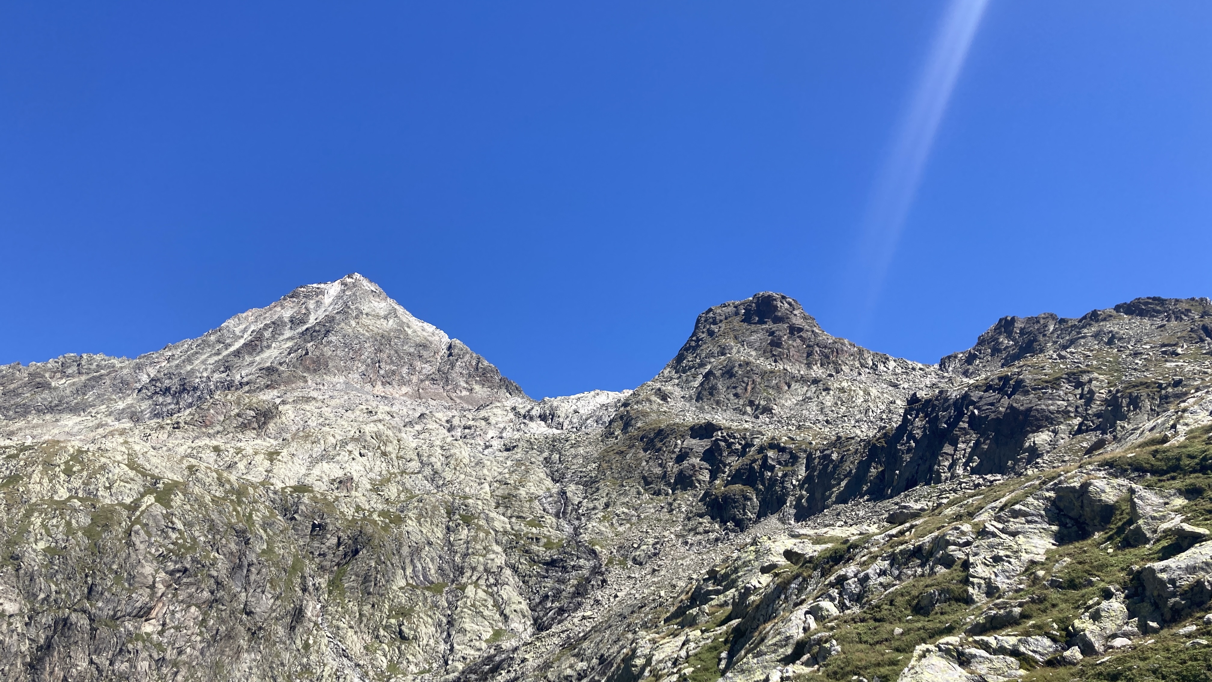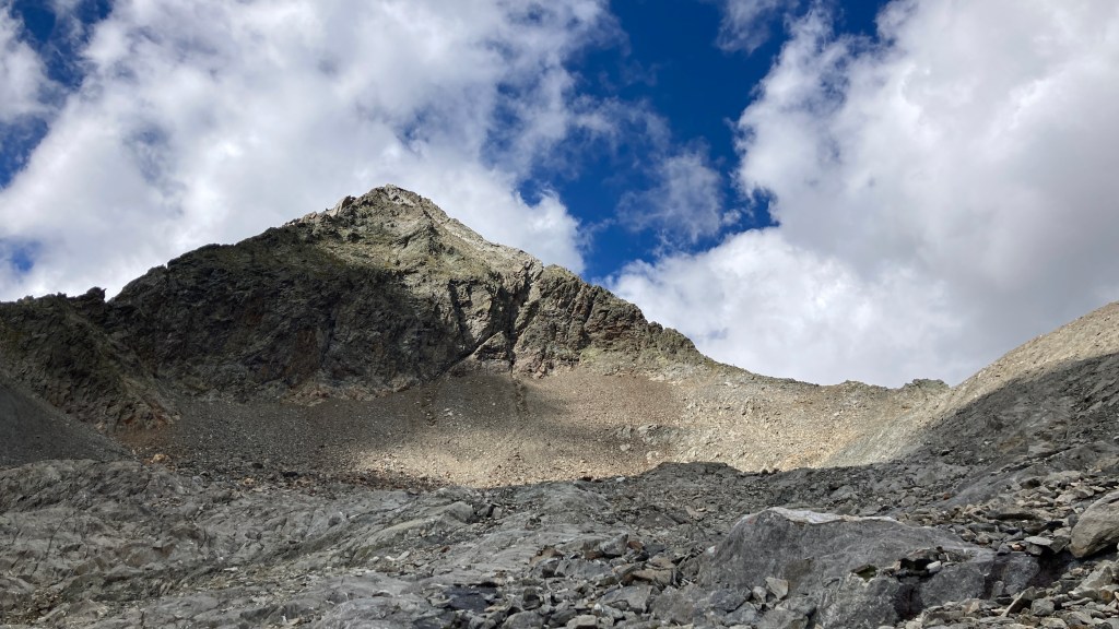 Nach der Stärkung setzen wir unseren Weg durch das von nun an steinige Gelände fort. Wir schreiten über große Granitplatten, die von Eis und Geröll geschliffen wurden und kämpfen uns durch losen Schotter weiter nach oben. Immer noch begleiten mich Zweifel, ob wir die Tour schaffen, da der Gipfel nach wie vor, scheinbar unerreichbar über uns thront. Aufgrund der Höhe (wir sind über 2.500m) kommt auch noch ein weiterer Faktor hinzu, der mich etwas überrascht hat und den ich unterschätzt habe: Die Luft wird deutlich dünner. Bei uns beiden ist der Puls gestiegen und so flott und spritzig wie unten im Tal kommen wir nun nicht mehr voran.