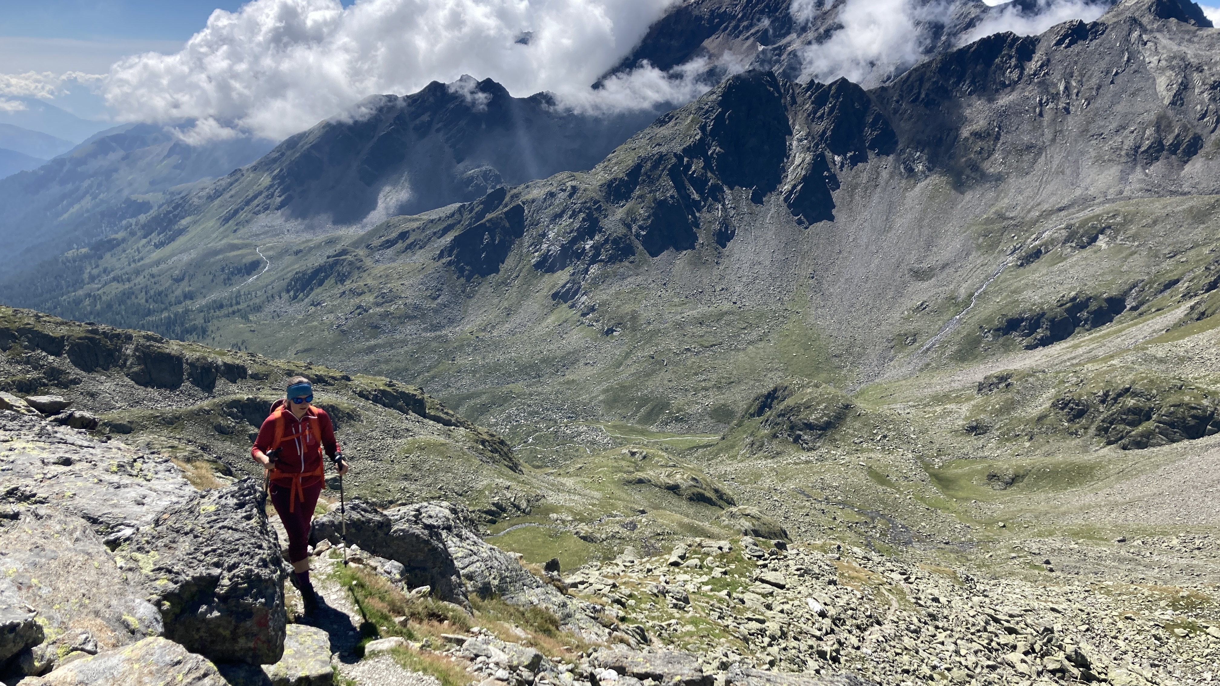 Mittlerweile haben wir unseren Rythmus gefunden, Gehpassagen wechseln sich mit Querungen über Fels- und Schotterfelder ab. Der Weg ist an sich gut markiert, man muss aber immer wachsam bleiben und nach dem nächsten rot-weiß-rot bestrichenen Stein Ausschau halten, da man sonst schnell vom richtigen Pfad abkommen kann. So geht’s über 400hm nach oben, bis wir, nach einer weiteren Stunde Gehzeit, auf eine größere Wiesenfläche kommen. Neben uns ist das Gipfelkreuz des Debantgrats zu erkennen und hinter uns ragt der Hochschober auf. Wir nutzen diese Hochalpine Kulisse für unsere erste größere Pause, setzen uns ins Gras und genießen unser mitgebrachtes Essen.