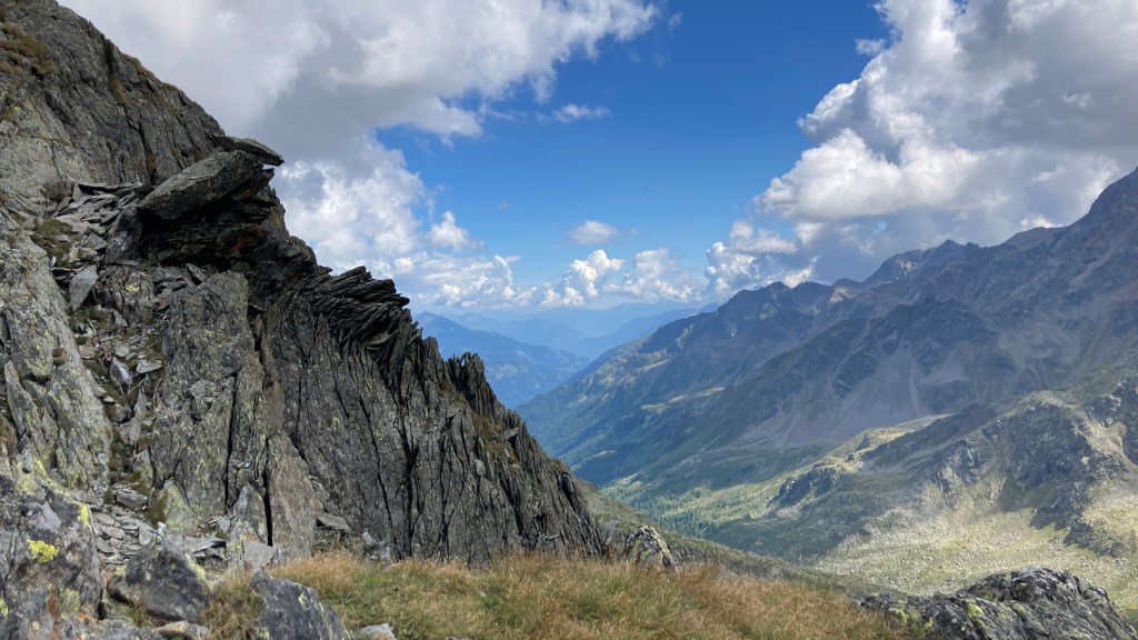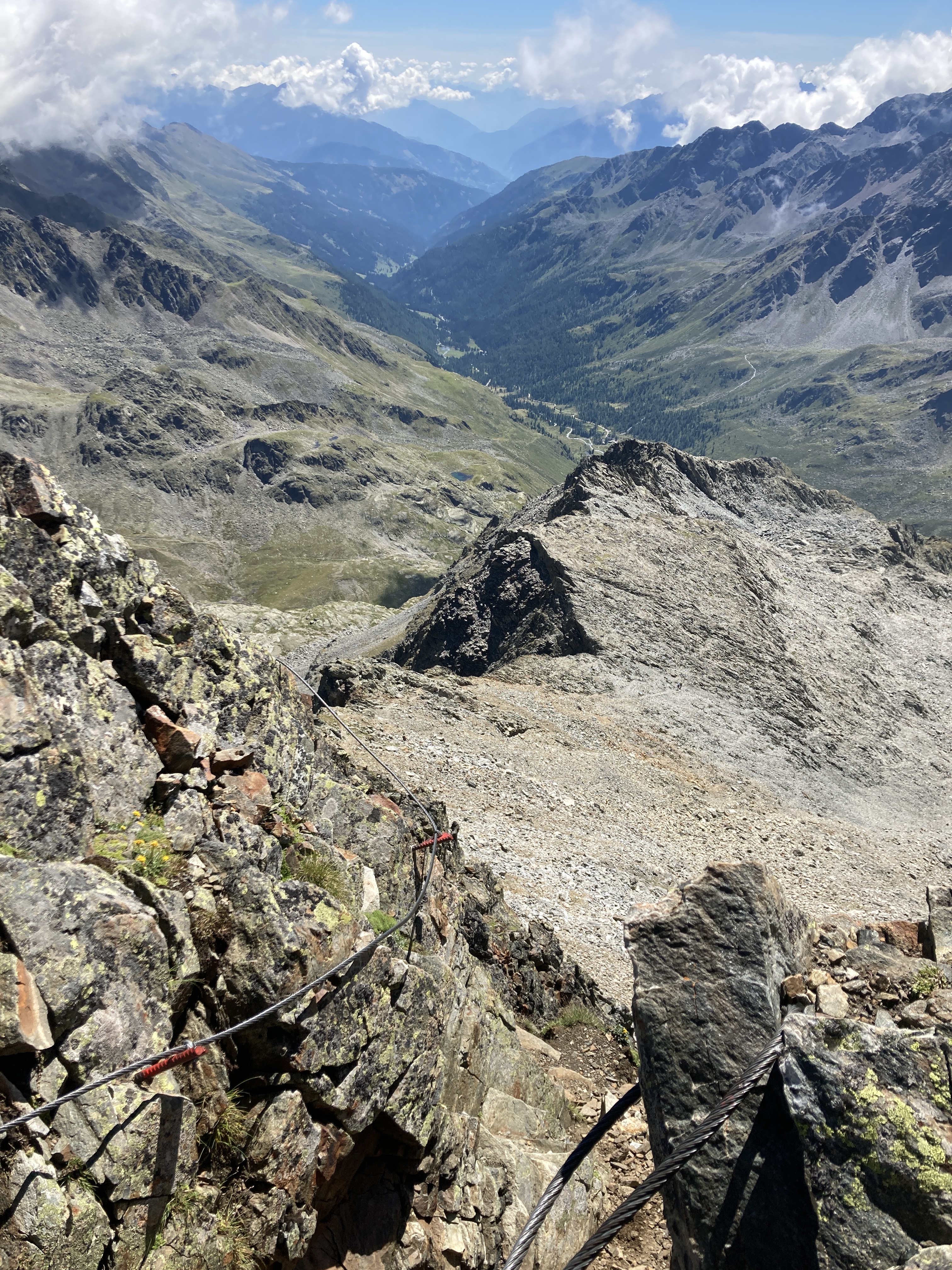 Dieser Klettersteig wurde im Zuge einer Sanierung vor einigen Jahren entlang des Normalweges am Südostgrat des Berges eingezogen. Eingestuft ist er mit B, wobei eine Variante über eine Seilbrücke führt und diese eine mit C bewertete Stelle enthält. Wir legen also unsere Wanderstecken ab und schmeißen uns ins Klettersteiggeschirr. Da hinter uns schon ein paar Quellwolken durchs Debanttal ziehen, habe ich mich bei zwei Entgegenkommenden noch bezüglich der Aussicht am Gipfel erkundigt. Als Antwort gabs im ur-Osttiroler Dialekt: „Locht sche uma da Glockna“. Na bitte, da freut man sich auf den Aufstieg. So arbeiten wir uns die ersten Drahtseilabschnitte nach oben, immer entlang des Grates. Am Klettersteig kommen uns mehr Leute entgegen als entlang des gesamten Aufstiegsweges.