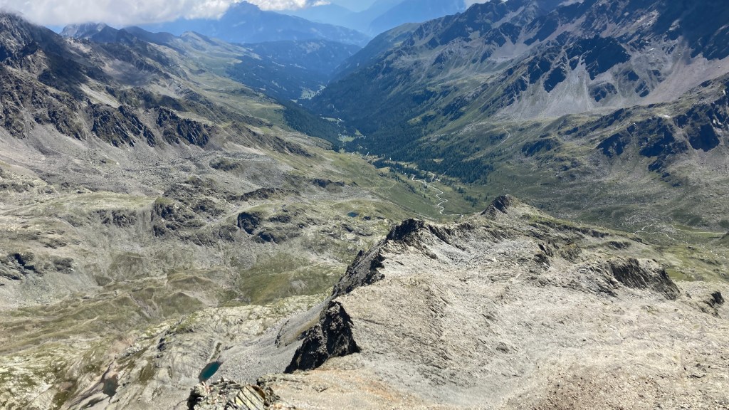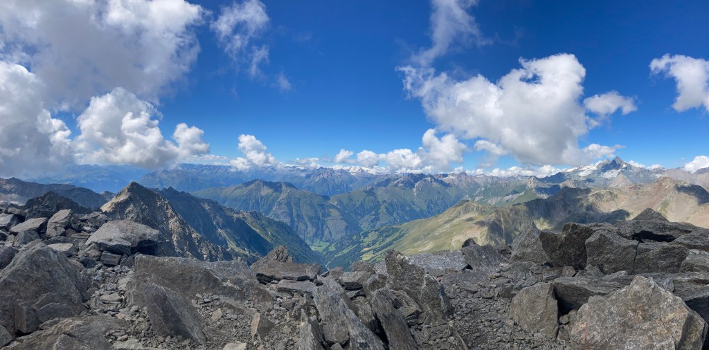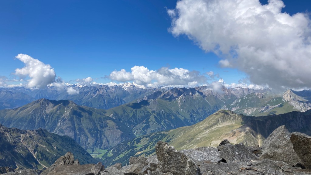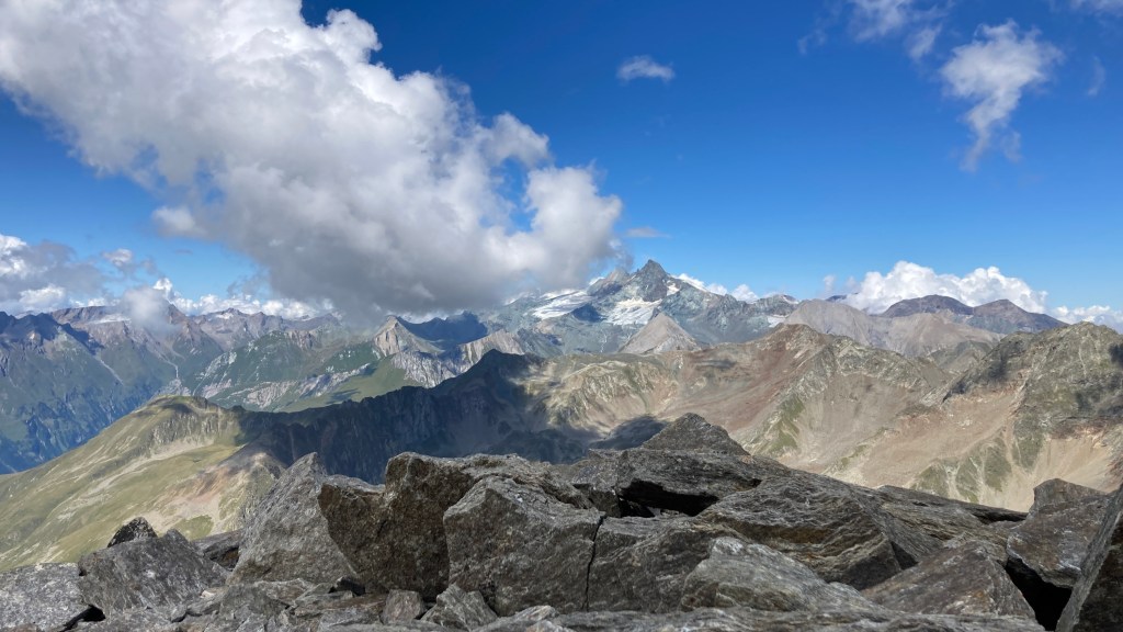 Gleich im Norden steht man sozusagen Face-to-Face mit „seiner Majestät“ – Österreichs höchstem Berg: dem Großglockner. Von hier betrachtet weiß man, warum er den Beinamen „der schwarze Berg“ trägt. Wenn man genau hinsieht, erkennt man auf seiner Flanke die Erzherzog Johann Hütte. Die auf der Adlersruhe gelegene Schutzhütte befindet sich auf 3.454m Höhe und ist damit die höchste Österreichs. Die Tauern reichen weiter nach Westen, bis hin zu dem schneebedeckten Gipfel der „weltalten Majestät“: dem Großvenediger. All die Anstrengung ist für einen Moment vergessen und die Gedanken verlieren sich in einem unendlich weit wirkendem Bergpanorama. Und wieder einmal wird man daran erinnert, wie klein man angesichts dieser beständigen Riesen doch ist.