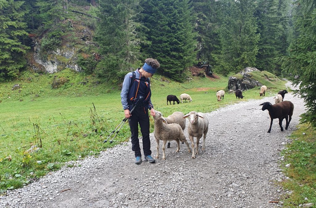 Eine Schafsherde bewacht den Weg vor uns, und mustert uns neugierig, als wir ihr näher kommen. Mit lauten „Mäh“-Rufen werden wir durchgewunken und setzen unsere Wanderung fort.