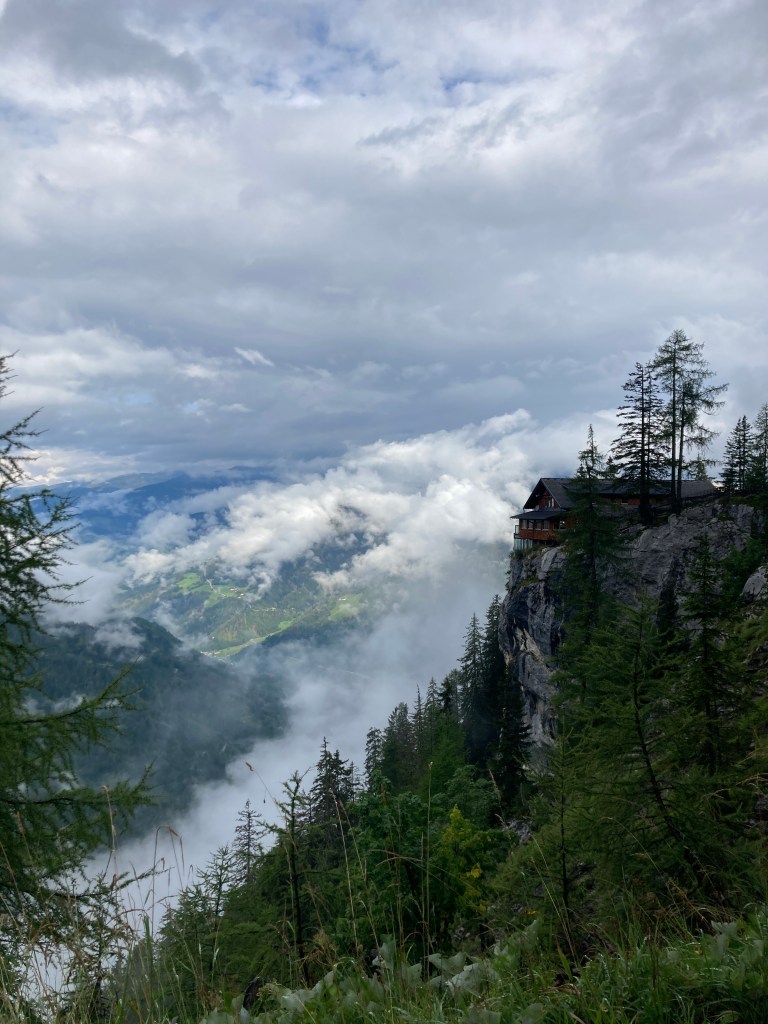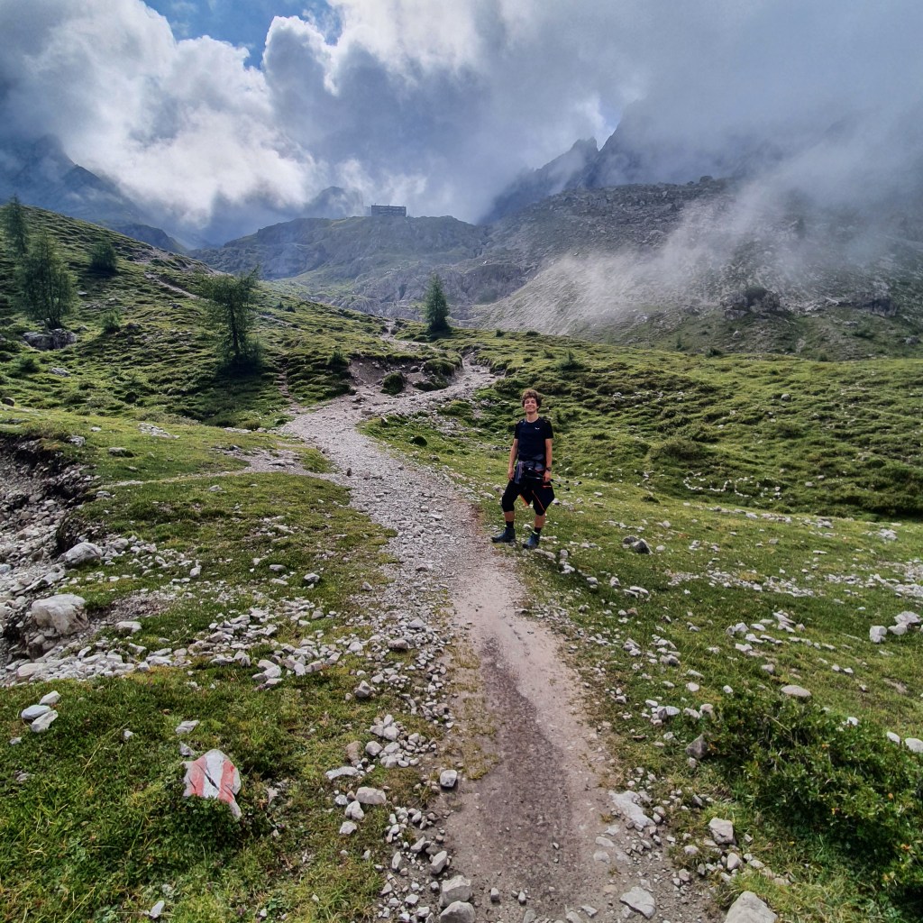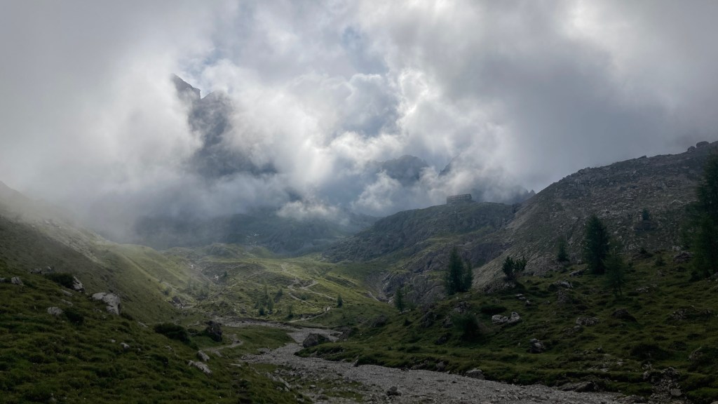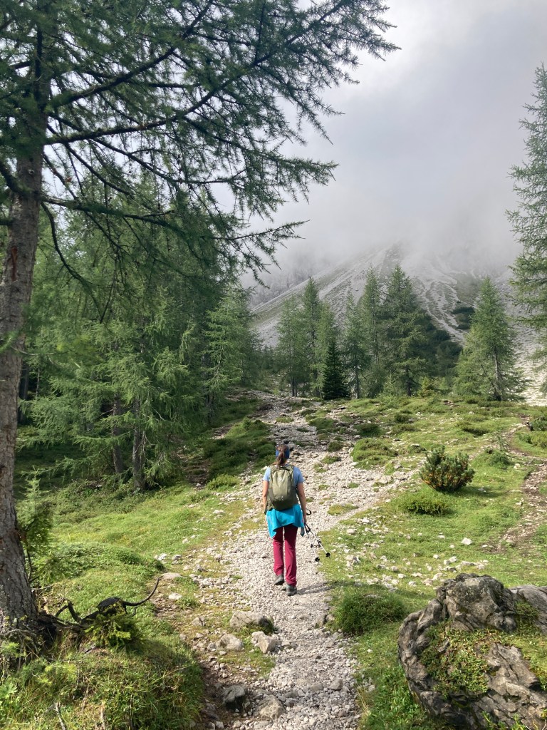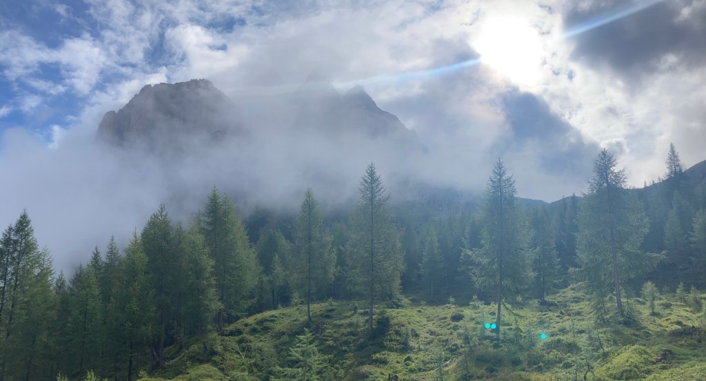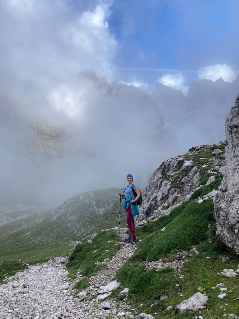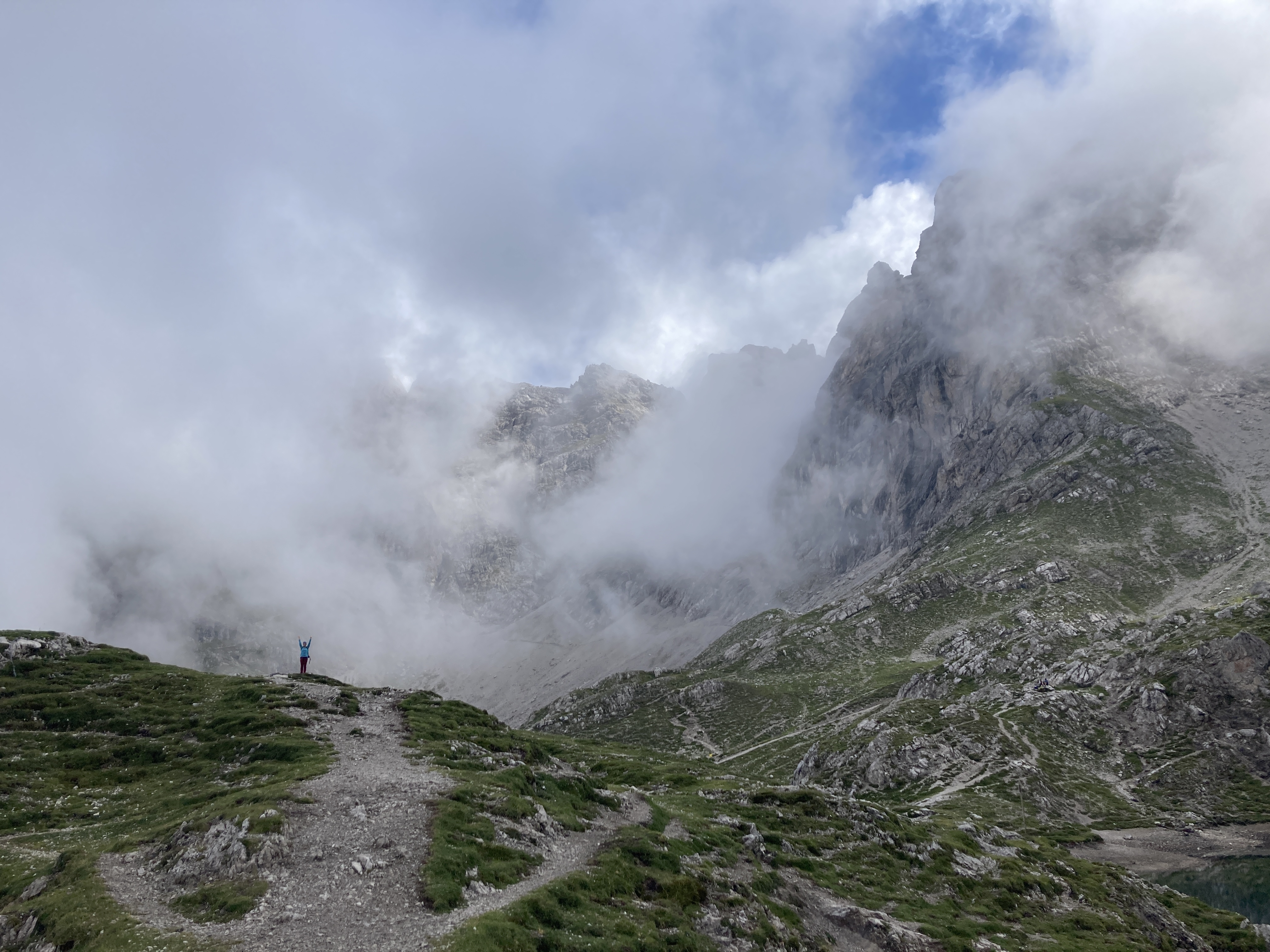 Es ist ein stark bewölkter und etwas kühlerer Sommertag. Dementsprechend hängen hier noch etliche Wolken in der Luft und für den ersten Wegabschnitt haben wir nur begrenzte Sicht. Die Wolken verfangen sich richtig an den Kesselwänden und ziehen nur langsam dahin. Kurzzeitig kann man einen Blick auf die mächtigen Felswände, wie beispielsweise die Laserzwand, erhaschen, bevor das Fenster schnell wieder zuzieht.