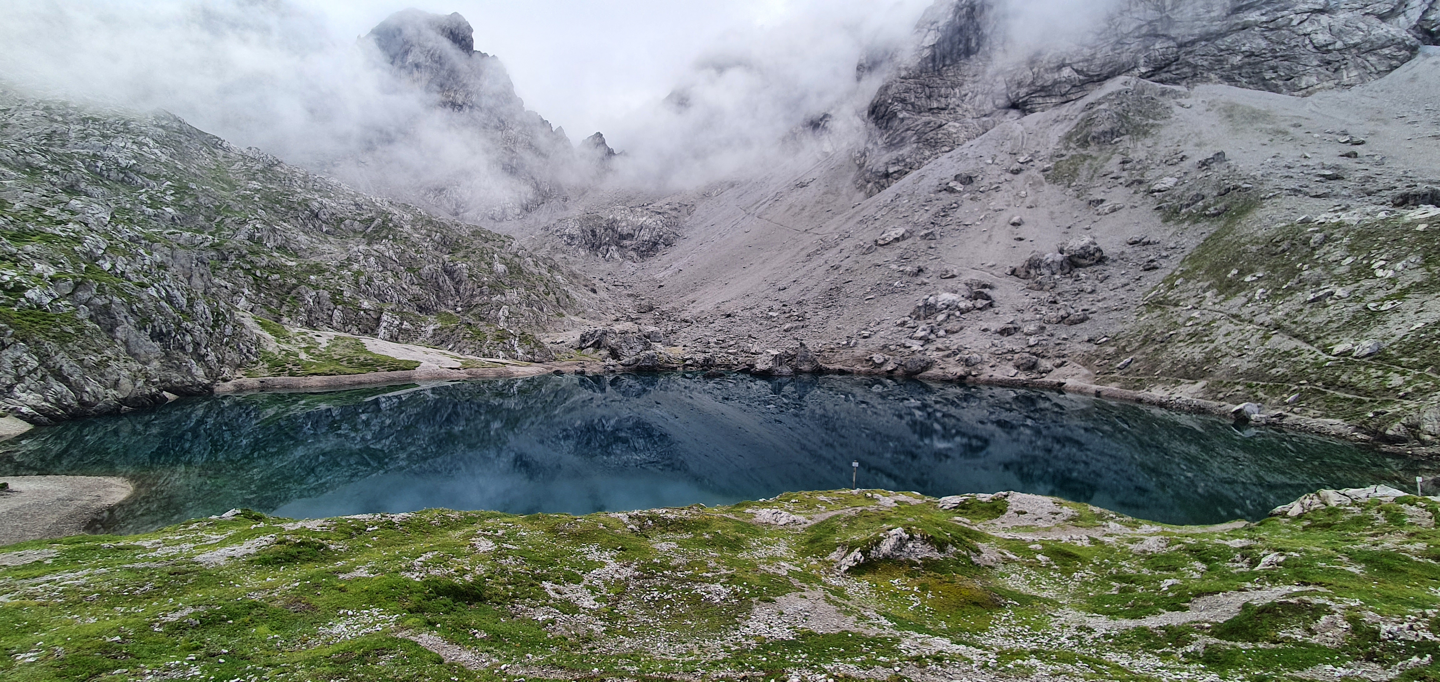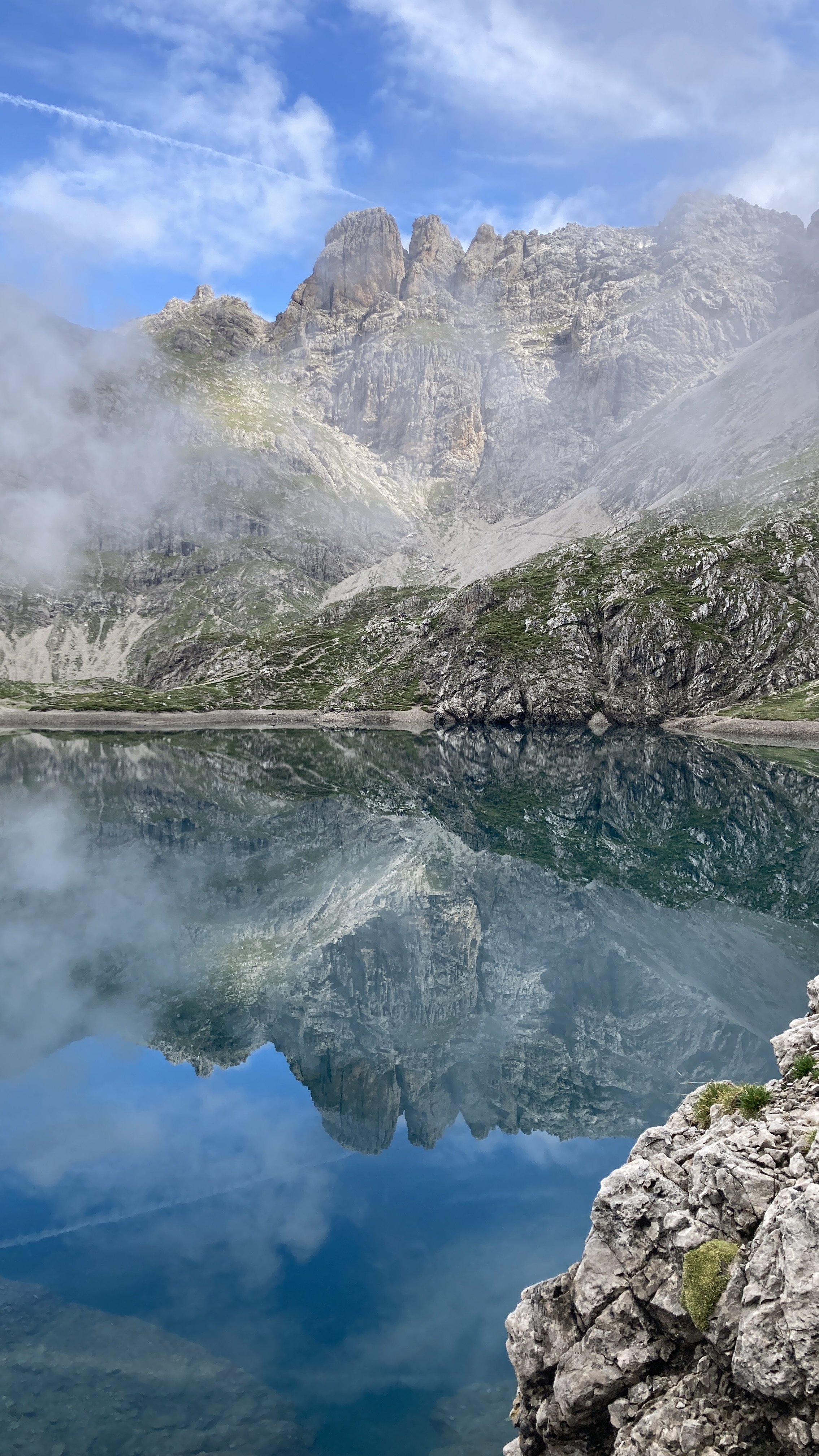 Durch den Kessel ist es hier heute so gut wie windstill, weshalb sich die umliegenden Gipfel und Felswände traumhaft schön im Wasser spiegeln. Dazu die Stille des Berges – wir sind im Moment die einzigen Wanderer am See – und die langsam über uns hinwegziehenden Wolken sorgen für eine eindrucksvolle, mystische Stimmung. Der Laserzsee erscheint uns heute als traumhaftes Naturjuwel und Kraftplatz.