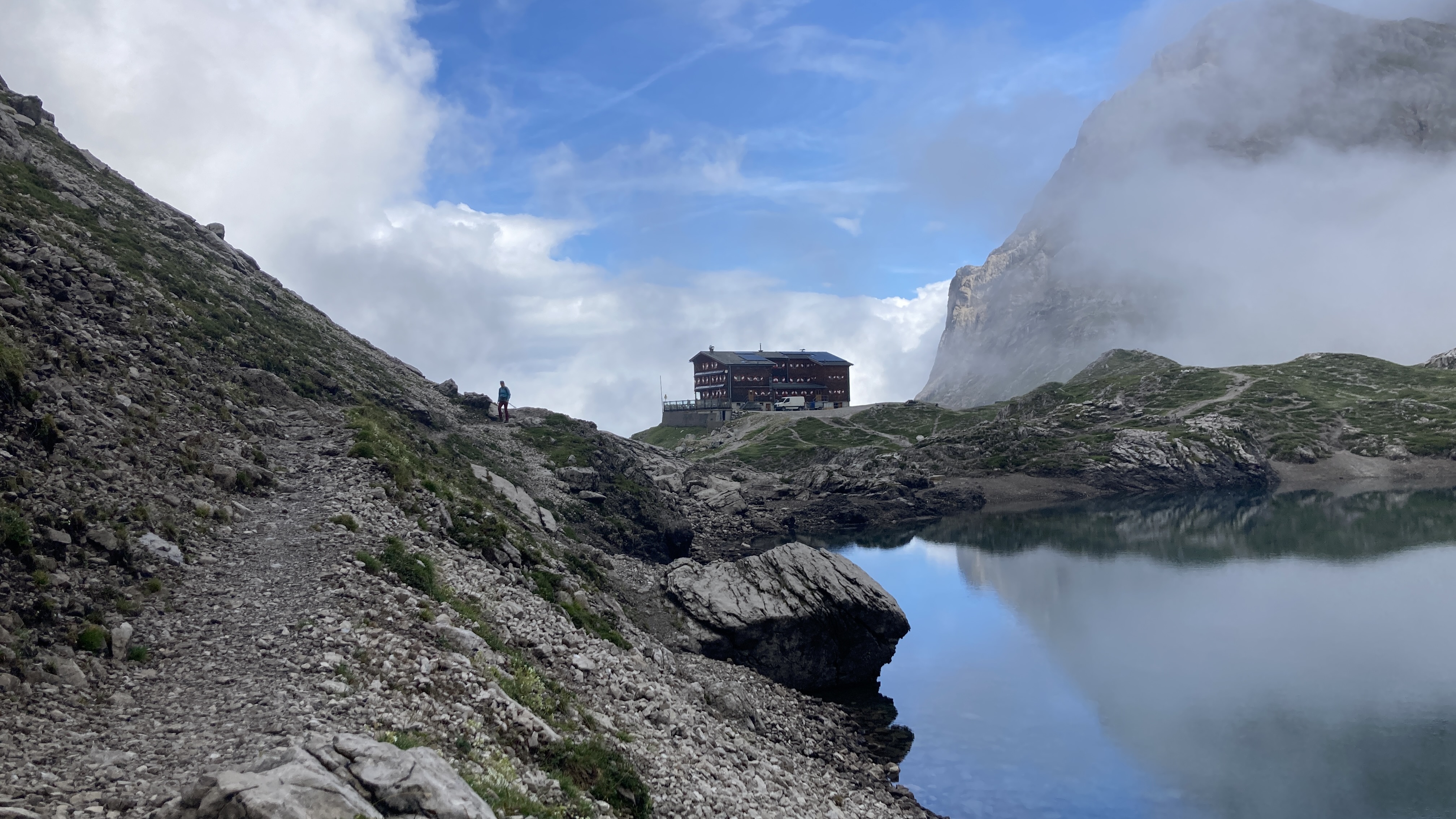 Wir kommen schnell voran und erblicken nach etwa einer Stunde Wanderzeit auch schon die Karlsbader Hütte. Die Sonne wärmt die Umgebung auf und so ziehen die Wolken immer höher. Der ein oder andere Sonnenstrahl verirrt sich durch die Wolkendecke und findet seinen Weg bis zu uns. Mit dem Ziel vor Augen genießen wir die wärmenden Strahlen und die direkt magische Atmosphäre.