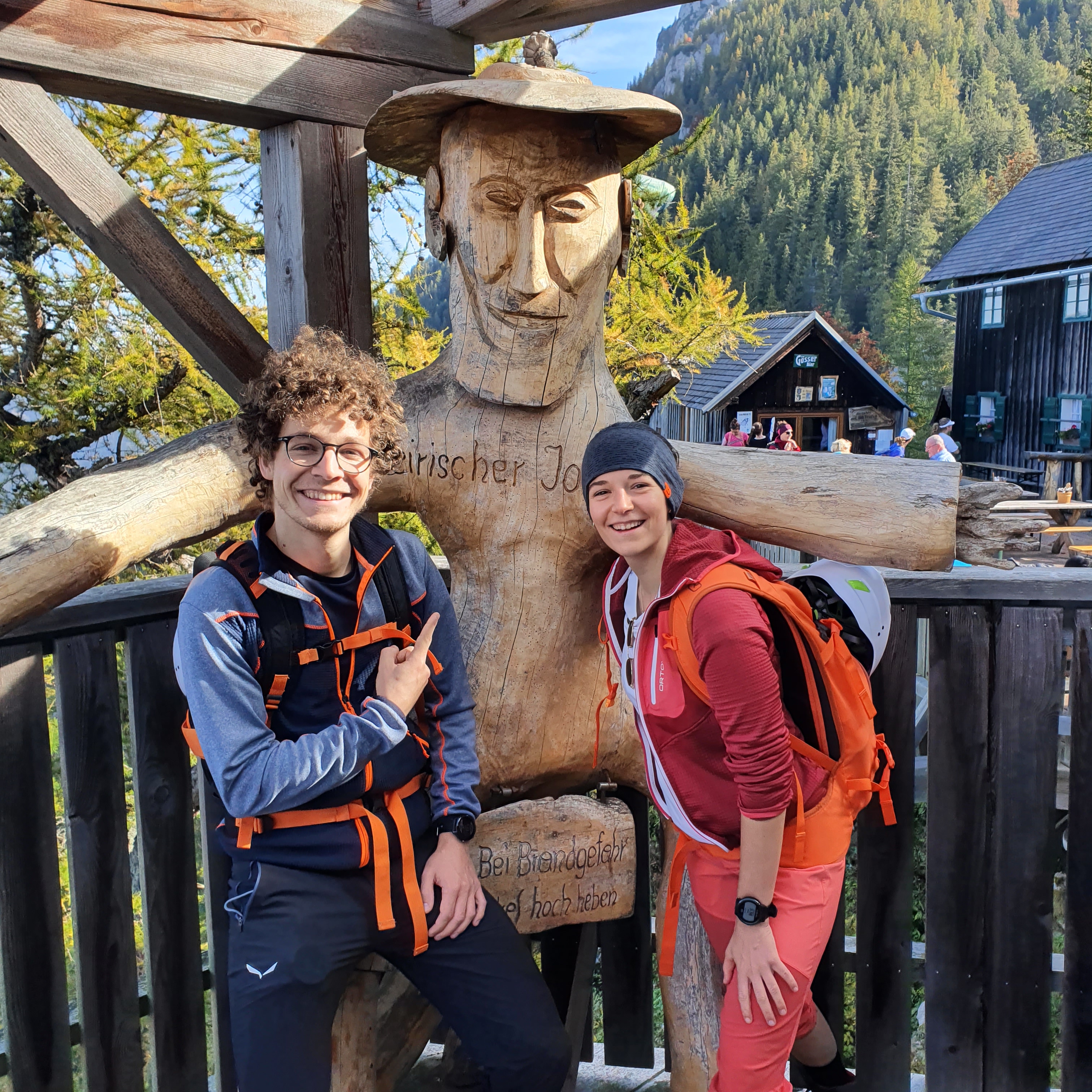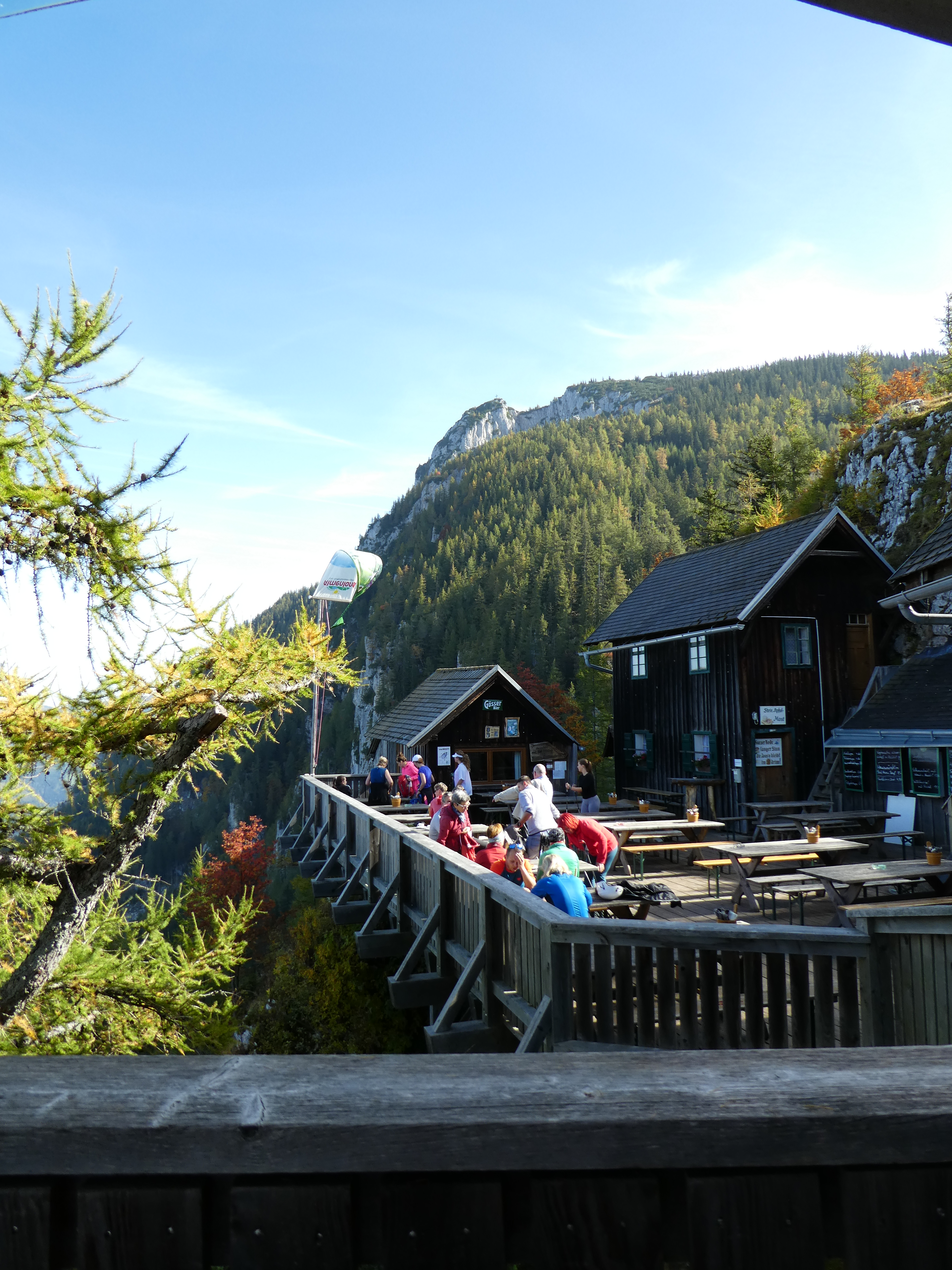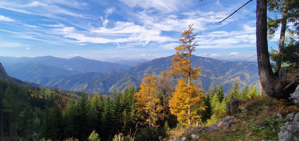 Wir legen eine kurze Pause ein und genießen die warmen Sonnenstrahlen, die ihren Weg auf die Terrasse finden. Im Hintergrund sieht man bereits den Hochlantsch und dessen Gipfelkreuz. Zuvor haben wir aber noch ein weiteres Ziel auf unserer heutigen Tour.