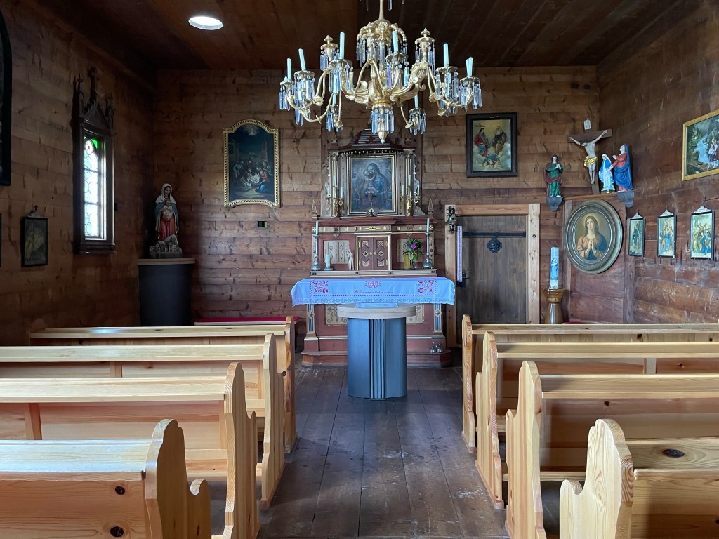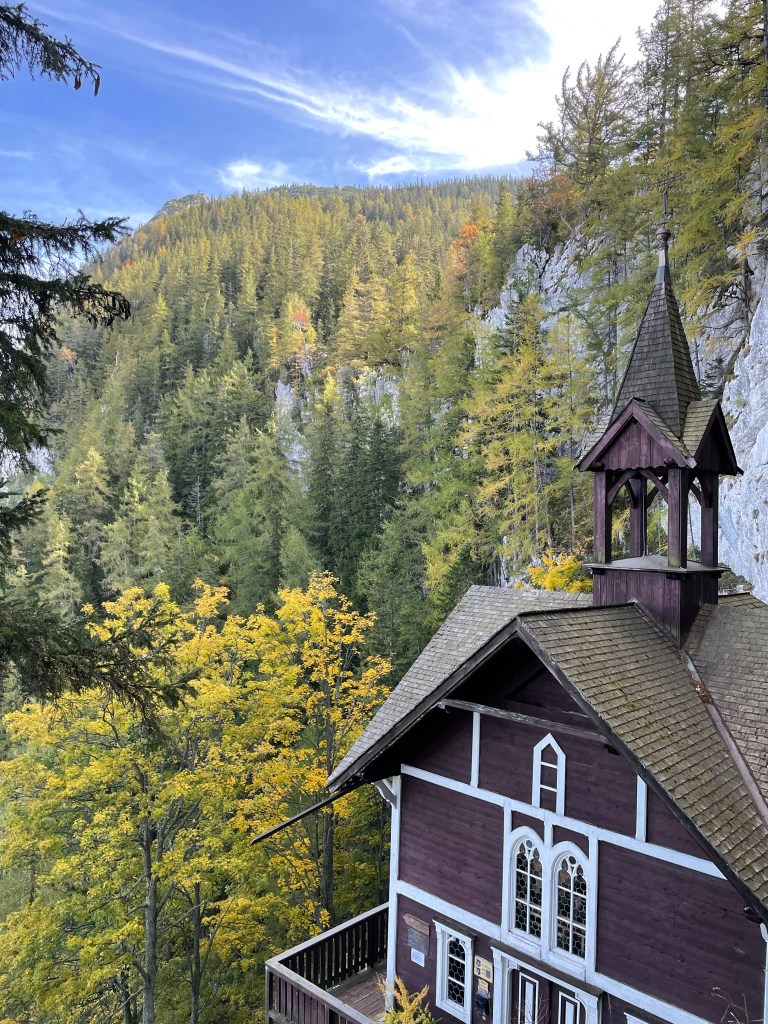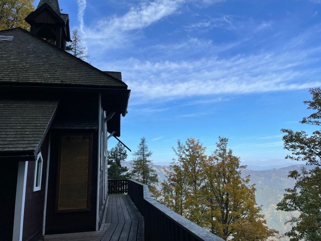 Vom Steirischen Jokl aus führen uns steile Holzstufen ca. 30 Höhenmeter hinab zur Kapelle. Wir schauen uns kurz im urig eingerichteten Inneren um, sehen uns die Quelle im Felsen an der Rückseite der Kapelle an und zünden zwei Kerzen an, ehe wir unseren Weg fortsetzen.