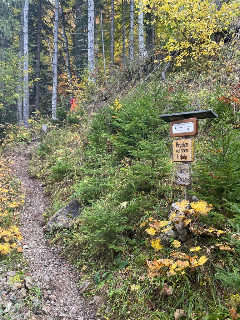 Nach einem etwa 20-minütigen Abstieg über 200hm folgen wir einem Forstweg, wo uns nach weiteren 10 Minuten ein Schild den Weg zum Klettersteig weist. Der Zustieg ist ein kleinerer Pfad, welcher über einige Wurzeln und Steine relativ steil nach oben führt. An den paar Abzweigungen, die es hier gibt, sind immer wieder Schilder, die Richtung „Franz-Scheikl Klettersteig“ weisen.