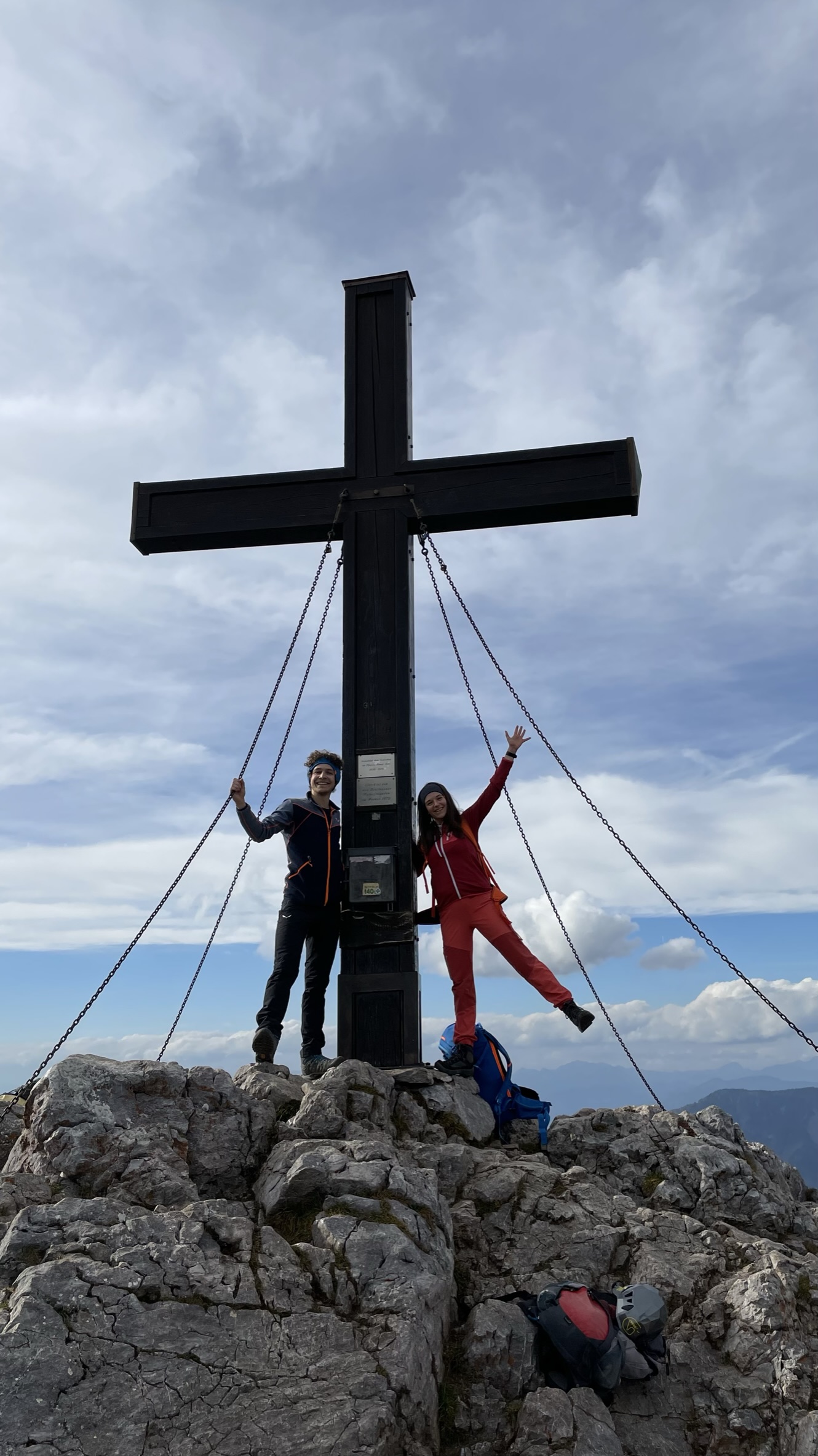 Nach dem Ausstieg ist man in wenigen Minuten am Gipfel angekommen. Vom Steirischen Jokl bis zum Gipfelkreuz haben wir gut 3h gebraucht, wobei wir uns im Steig Zeit gelassen haben. Am Gipfel des 1.720m hohen Hochlantsch genehmigen wir uns eine kurze Rast und lassen den Blick nochmals über die bunten Farben der umliegenden Bäume und die sanften, grünen Hügeln des Grazer Berglandes schweifen .