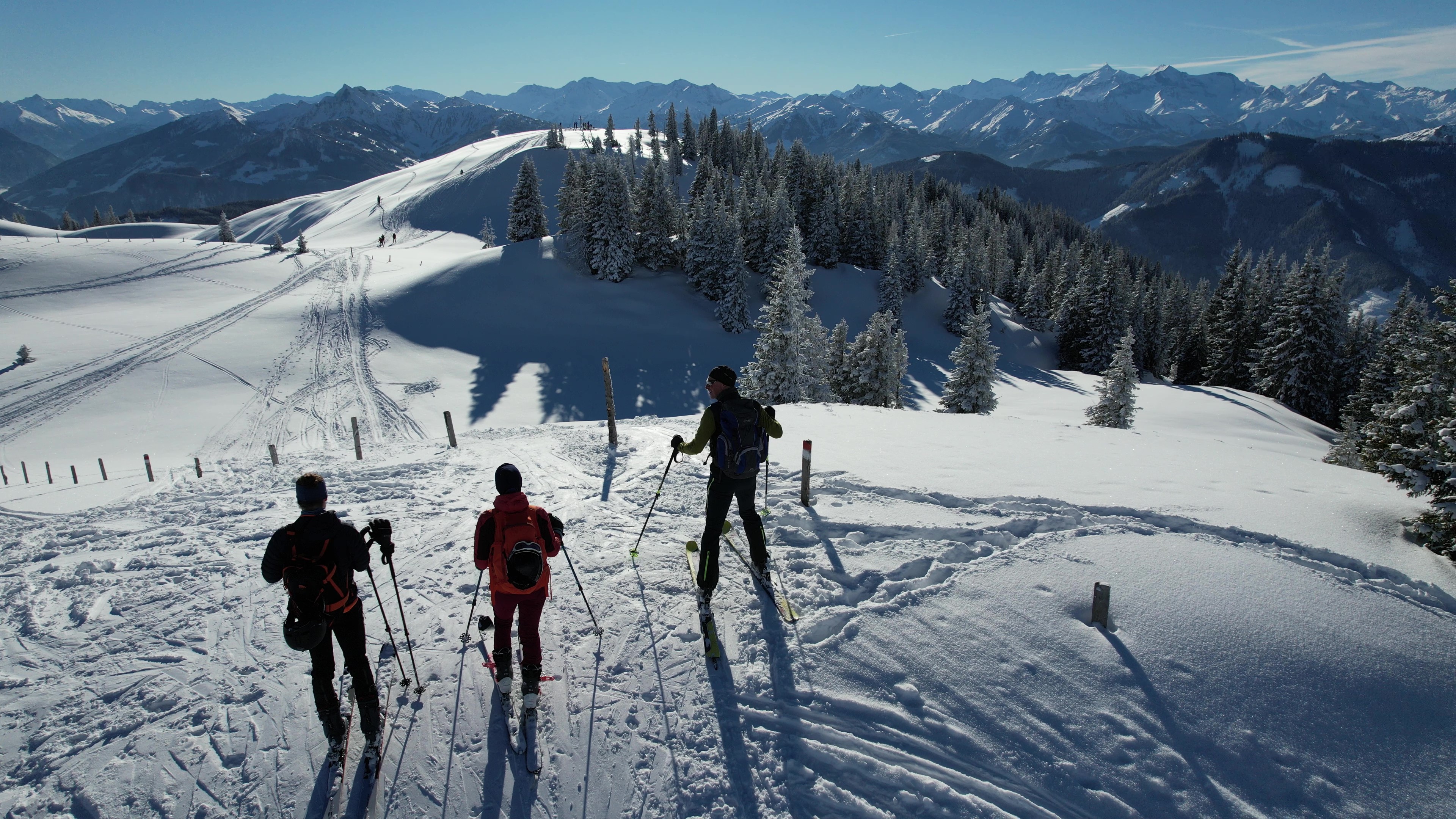 Ausgangspunkt der Tour ist der Dientner Sattel, am Parkplatz der Mittereggalm. Von hier aus fährt man ein paar Höhenmeter bergab in Richtung Süden, wo der Weg durch den Wald beginnt. Wer schon öfters mit Tourenski unterwegs war, kann diese Rutsch-Passage auch mit aufgefellten Skiern zurücklegen.