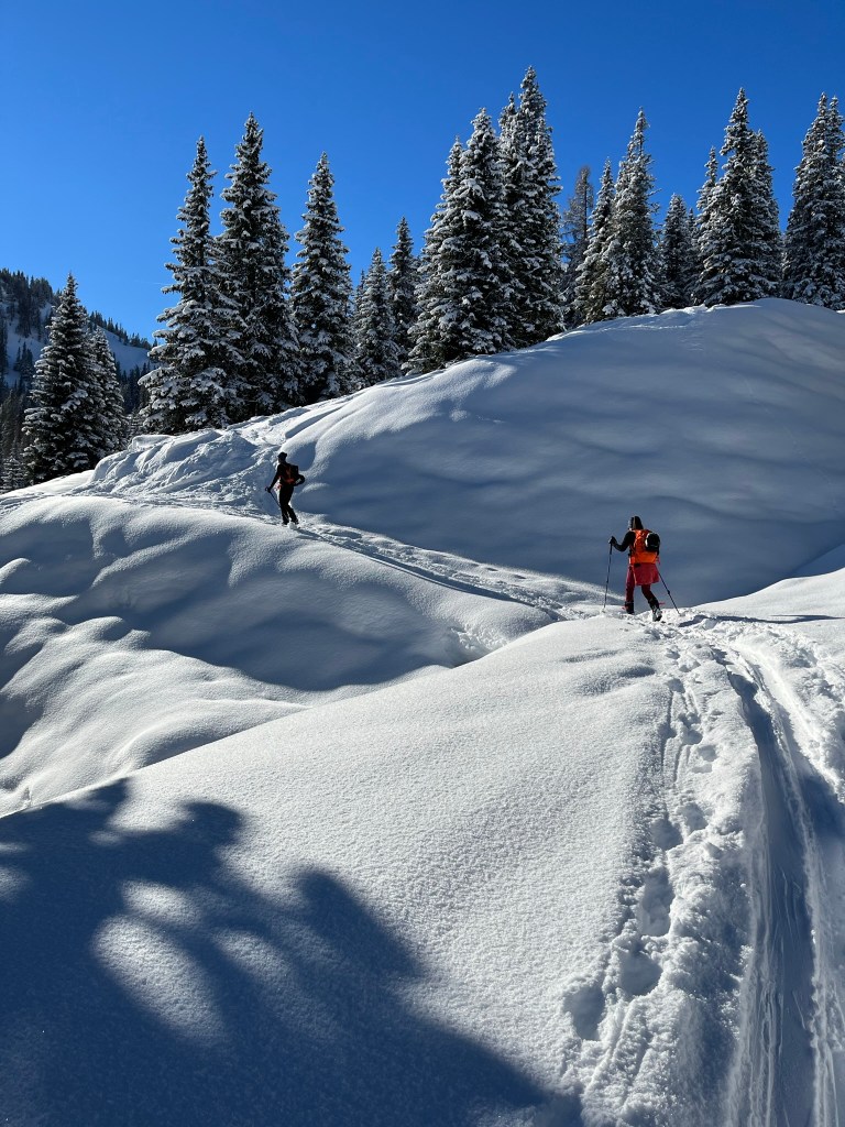 Etwas kniffliger gestalten sich nur die beiden Überquerungen zweier Bächlein, die den Schnee wegtransportiert haben. Wer sich auf Tourenski noch nicht so wohl fühlt, kann dafür aber schnell ab- und wieder anschnallen.