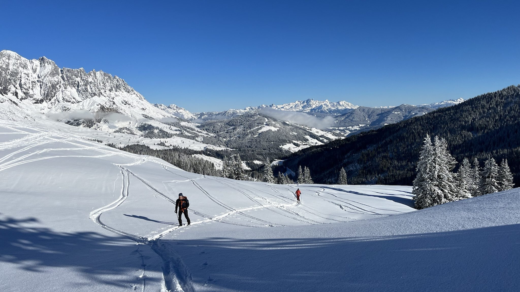 Bevor wir uns in die verdiente Abfahrt schmeißen, müssen wir zunächst nochmal über die Gegenanstiege und aufs Kollmannsegg. Dort fellen wir schließlich ab und freuen uns auf den frischen Pulverschnee. Auch bei der Abfahrt sollte man sich eher links halten, da zwei Bäche im Talkessel verlaufen, die man eher nicht queren möchte.