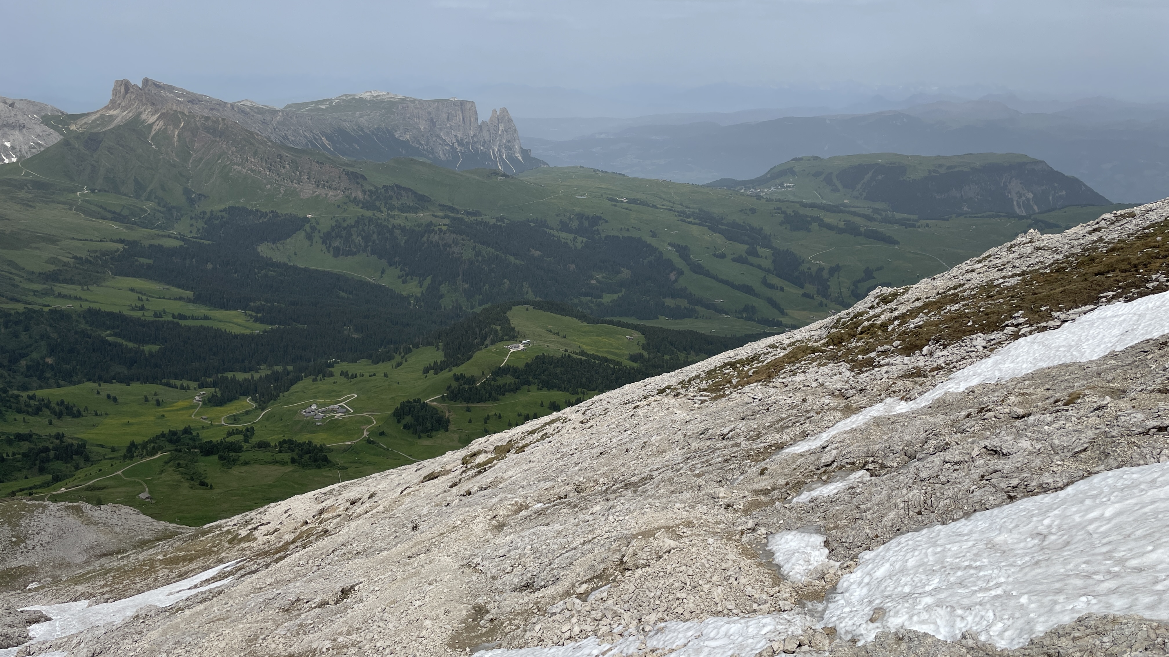 Angesichts dieses grandiosen Panoramas verblasst der Gipfel und wir fühlen uns angekommen in dieser gigantischen Bergwelt. Die grünen Wiesen und Wälder der Seiseralm stehen im krassen Kontrast zu den hellen Felsen von Rosengarten und Schlern. Schlussendlich gelangen wir für uns zu der Erkenntnis: nicht der Gipfel ist das Ziel einer gelungen Bergtour, sondern das Eintauchen in eine Anderswelt, die uns diese Naturriesen bieten, und uns damit die Nichtigkeit der Alltagsprobleme aufzeigen.