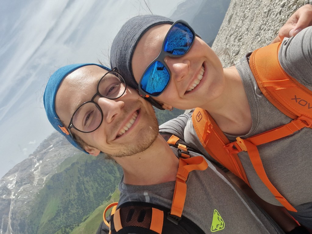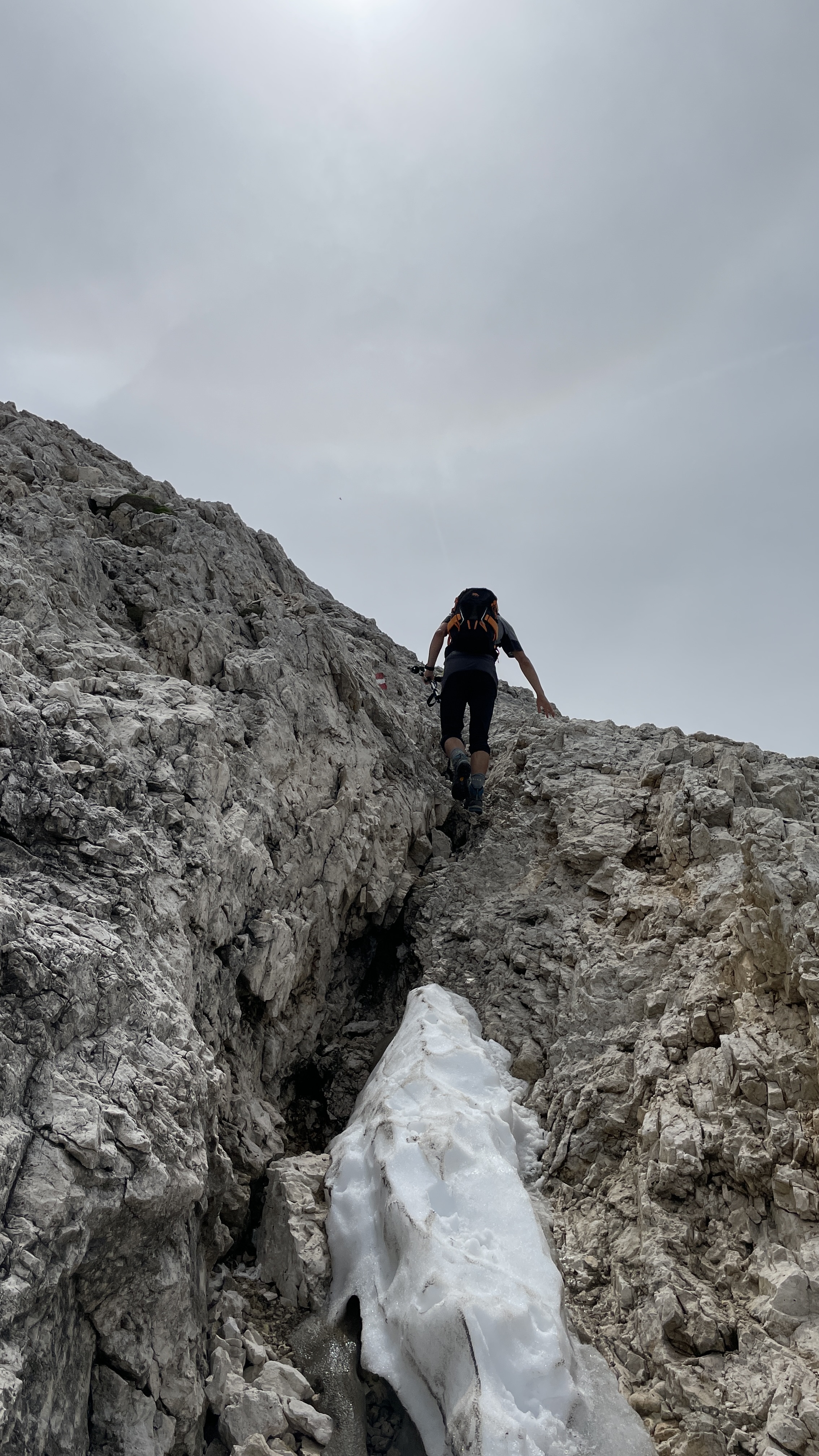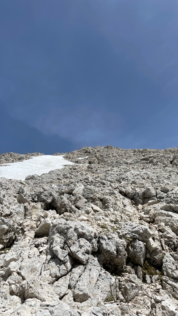Ein Stück weit kämpfen wir uns noch nach oben, arbeiten uns über die Schrofen und durch Schneefelder. Durch das schwere Gelände verlassen wir immer weiter unsere Komfortzone und so kommt das Gespräch zur möglichen Umkehr auf. Wir sprechen noch mit einem Entgegenkommenden über das weitere Gelände und probieren es noch ein paar Höhenmeter weiter. Wir sind hin- und hergerissen zwischen einem Gipfelsieg auf der einen und dem schwierigen Gelände auf der anderen Seite. Schlussendlich entschließen wir uns schweren Herzens 70hm unter dem Gipfel zur Umkehr.