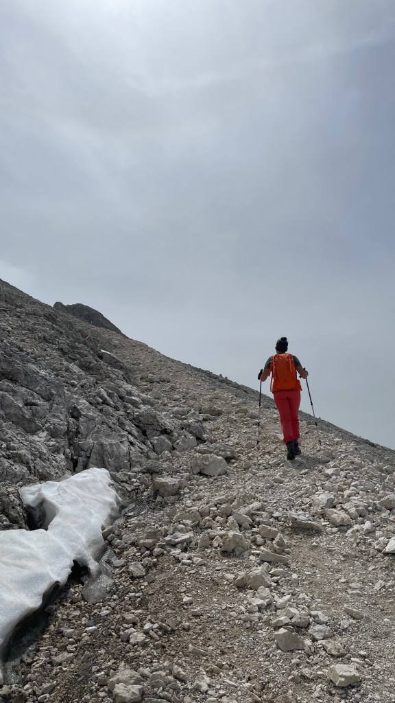 Nach etwa 2 Stunden Gehzeit passieren wir einen großen, aufgeschütteten Geröllhaufen, von wo aus der Weg – ein letztes mal in gut ausgebauter Form – in östlicher Richtung den Hang quert. Man nähert sich dem Gipfel von Süden bzw. über den Südost Grat. Dort gelangt man in sehr steiles und felsiges Gelände mit viel losem Geröll. Die Wegmarkierungen sind schwerer auszumachen, da nun am Boden verteilt, und steile Schneefelder, die es zu queren gilt, machen den Anstieg zu einer Bergtour anstatt einer technisch leichten Wanderung.