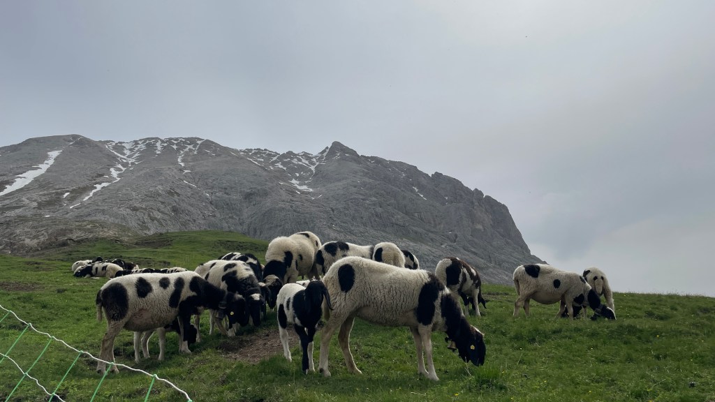 Nach den Bäumen und kleinen Wäldern der Seiseralm sind wir bereits über die Baumgrenze gelangt, wobei wir durch blühende Almwiesen und neben einer Schafweide wandern. Das Zwitschern der Vögel wird hier durch Murmeltier-Pfiffe abgelöst, welche trotz ihrer Lautstärke aber schwer auszumachen sind. Wer aufmerksam das Gelände absucht, wird hier aber auf der Suche nach den Nagern fündig werden.